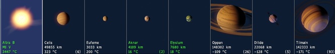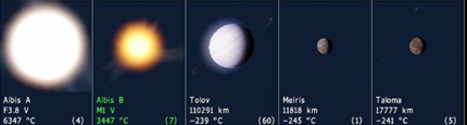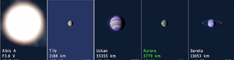 The System is a binary one, with a White Sun and an Red Dwarf Sun, named Albis A and Albis B respectively. There are two planets and a gas giant that orbit both suns.