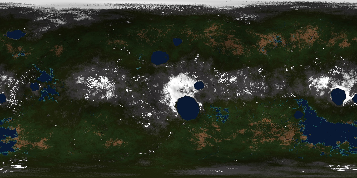 The world is covered by massive forests with only a few small landlocked seas. The tree trunks are thick and sturdy and much shorter than normal terrestrial forests.