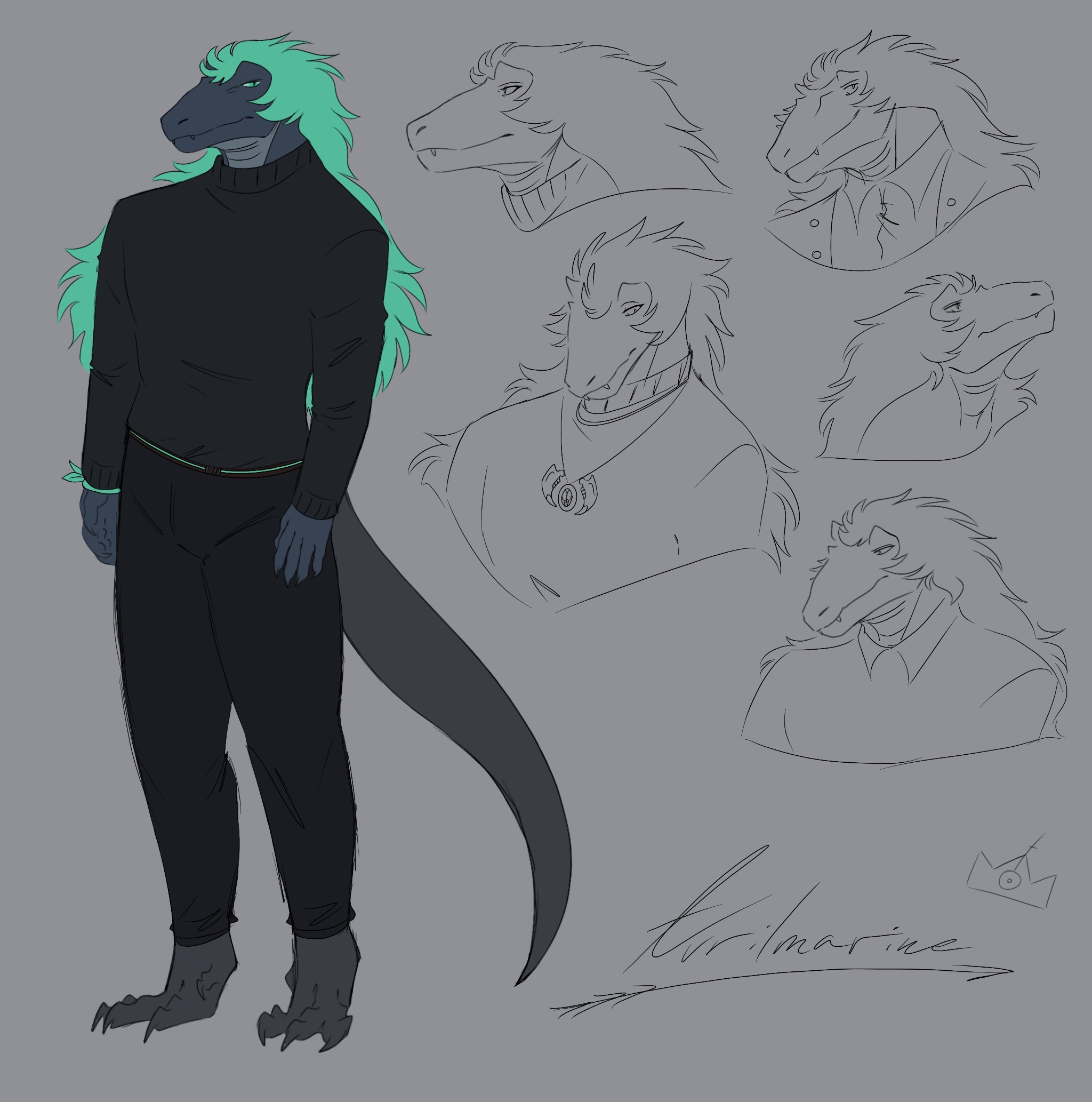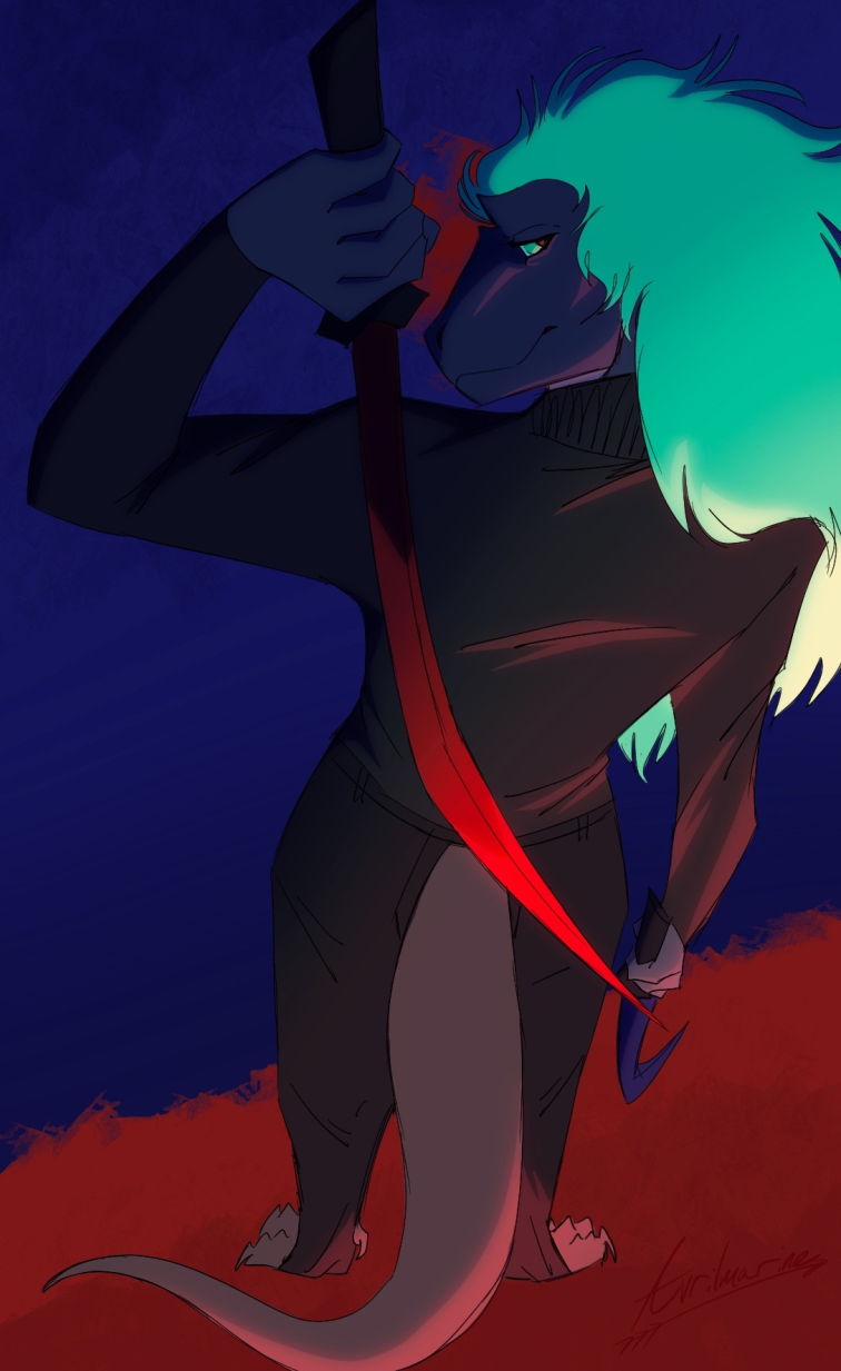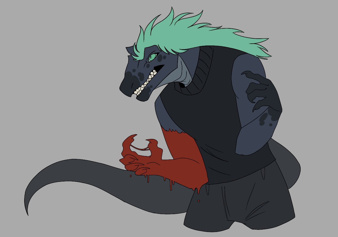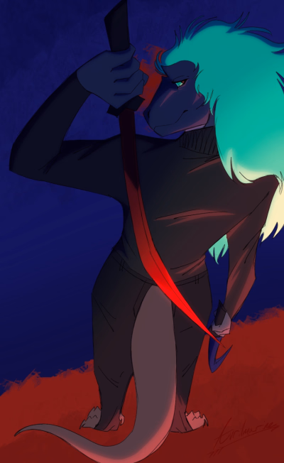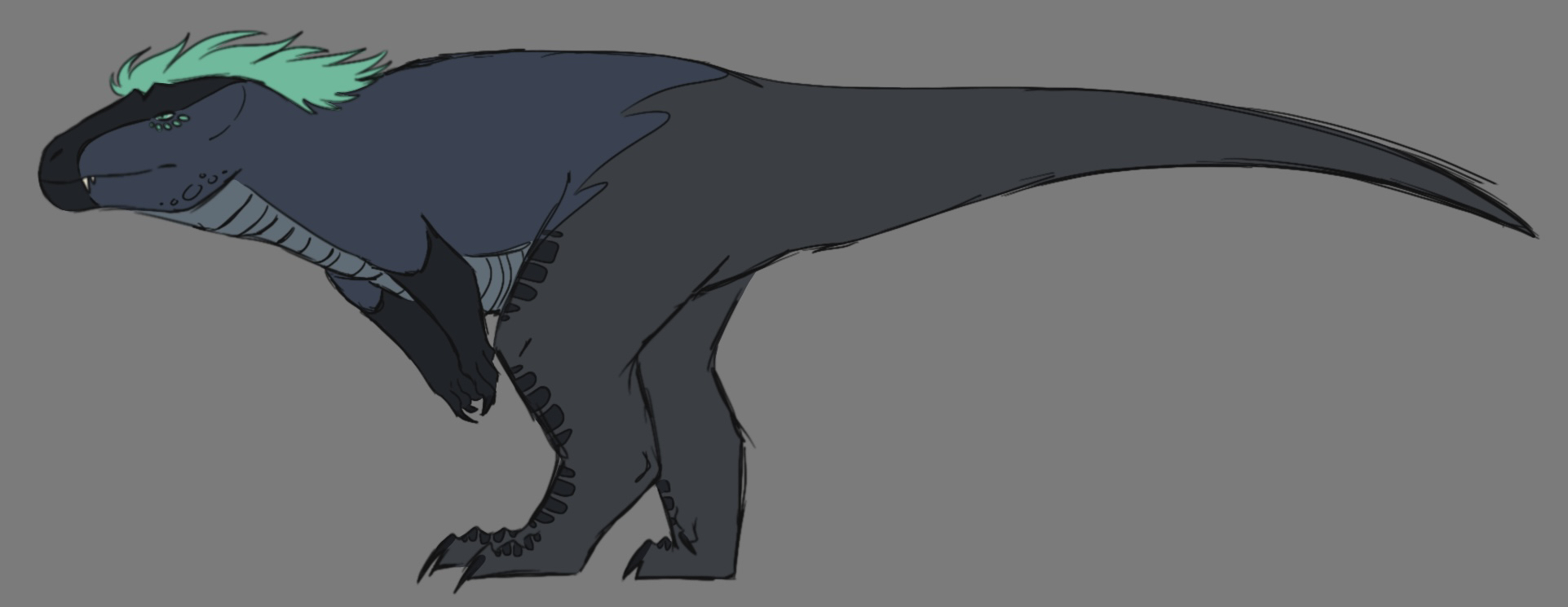 Aqua is a Giganotosaurus Saurian, meaning she posses Dinosaurian qualities. Her body is covered in small dark blue scales, which is usually covered up by her long dark clothes, such as turtle necks and sweat pants. Both her hands and feet are clawed, though she prefers to use weapons anyway. Like most Giganotosaurs, her face is long and narrow, with strong brow ridge over her green eyes. Her head feathers form a long flowing mane of sorts, which stands out with its cyan coloring.
