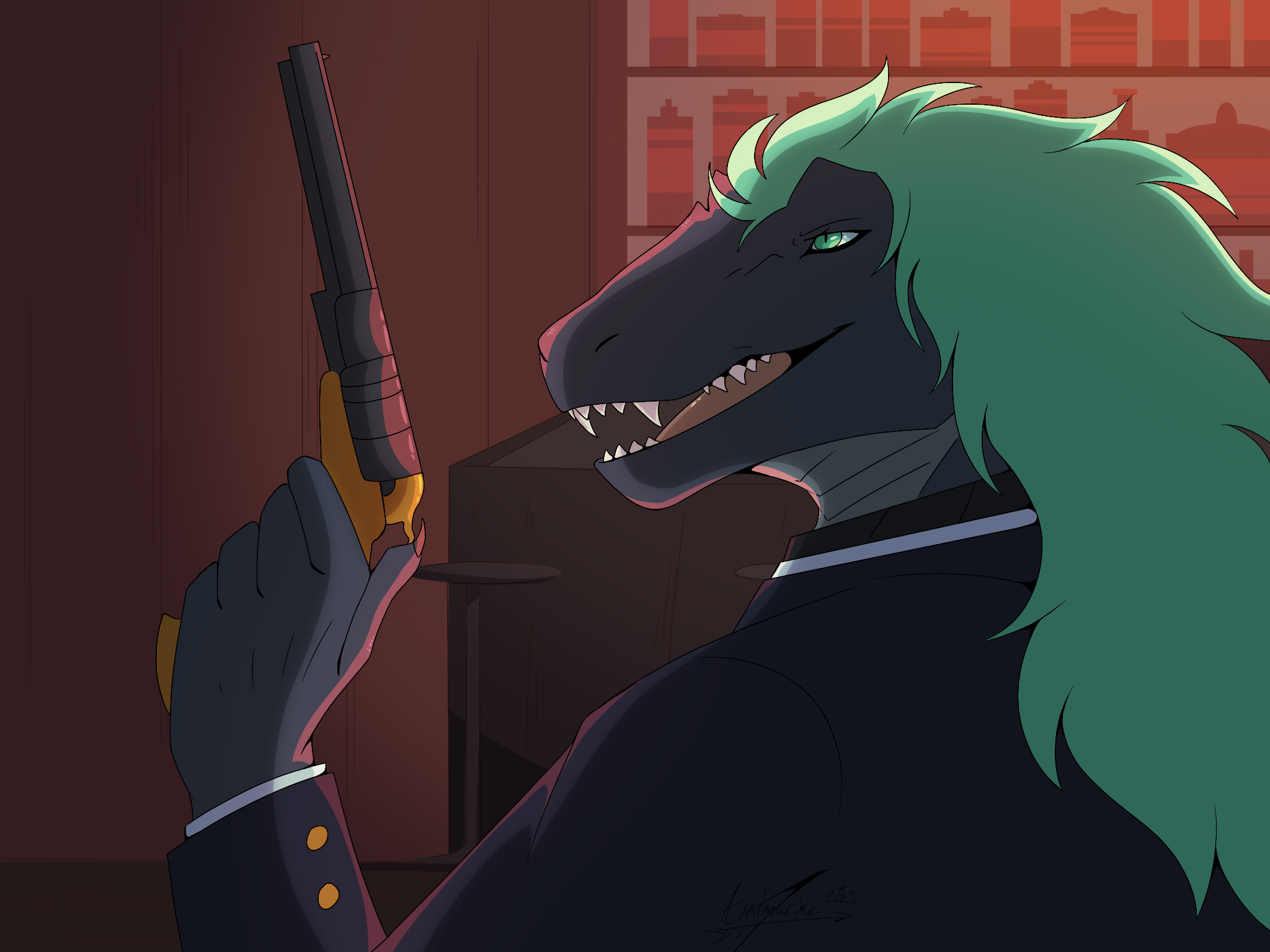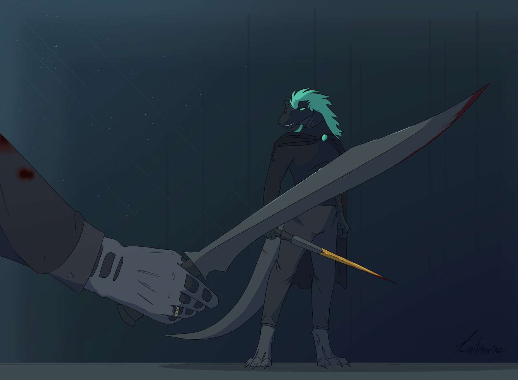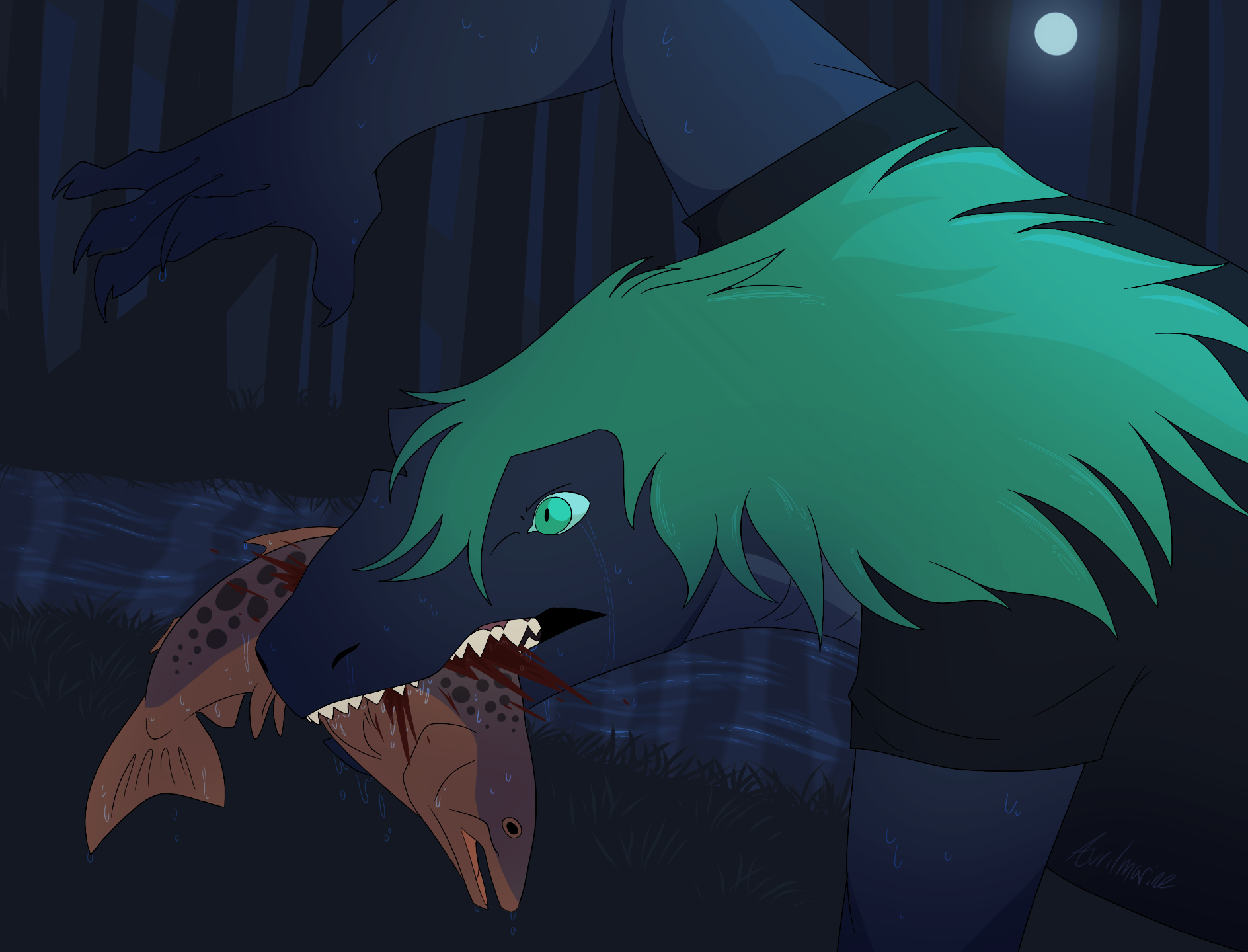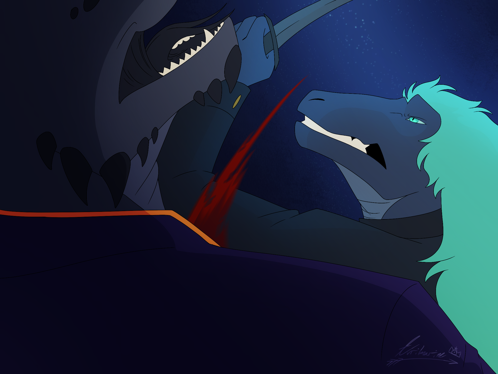 Aqua is a Giganotosaurus Saurian, meaning she posses Dinosaurian qualities. Her body is covered in small dark blue scales, which is usually covered up by her long dark clothes, such as turtle necks and sweat pants. Both her hands and feet are clawed, though she prefers to use weapons anyway. Like most Giganotosaurs, her face is long and narrow, with strong brow ridge over her green eyes. Her head feathers form a long flowing mane of sorts, which stands out with its cyan coloring.
