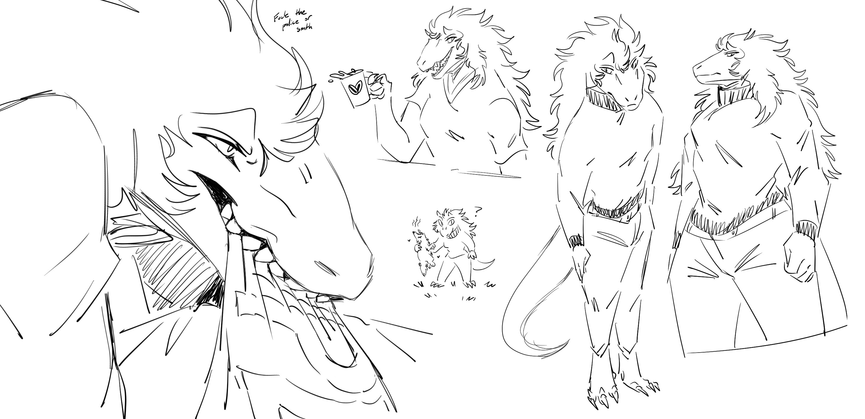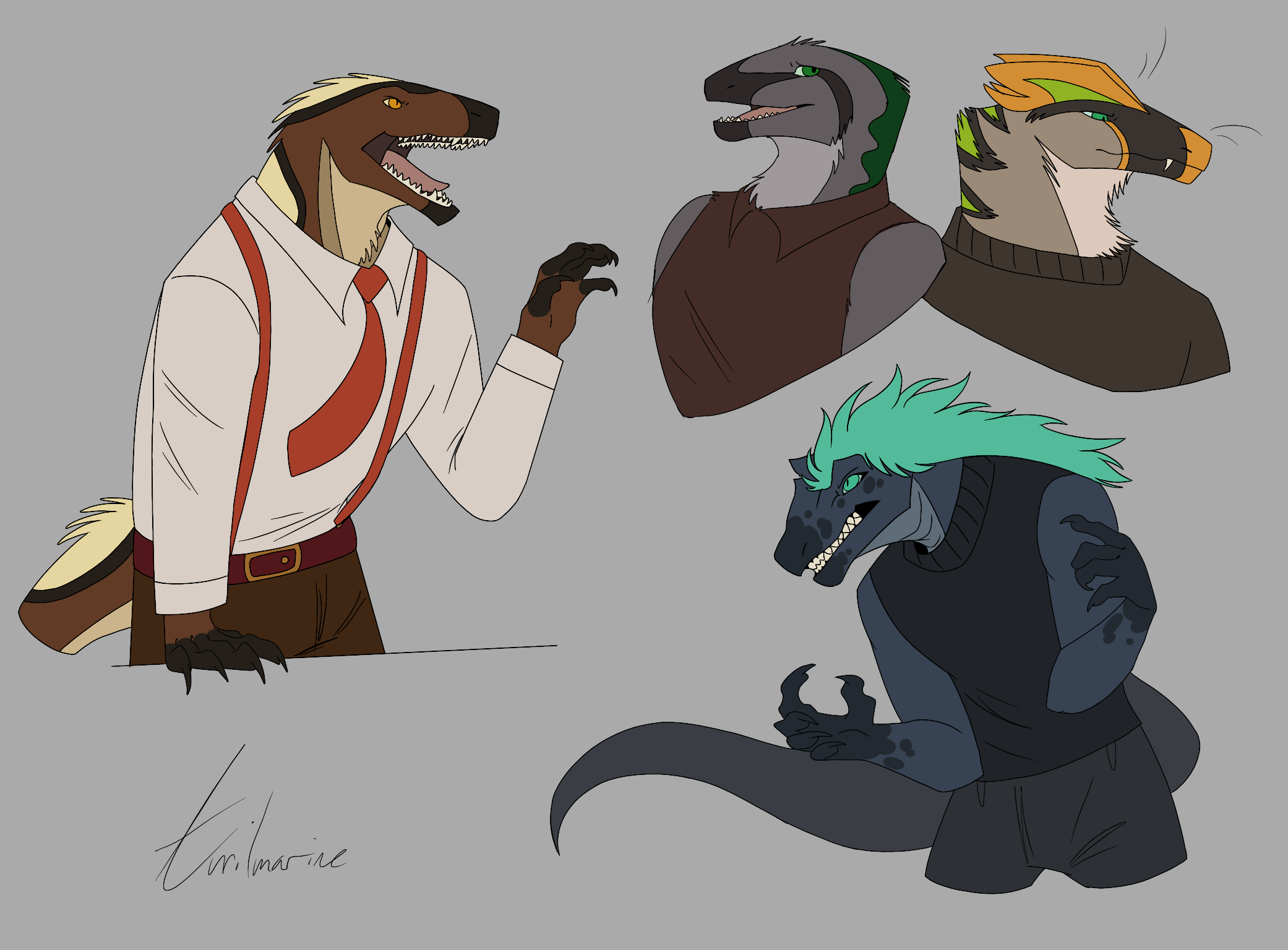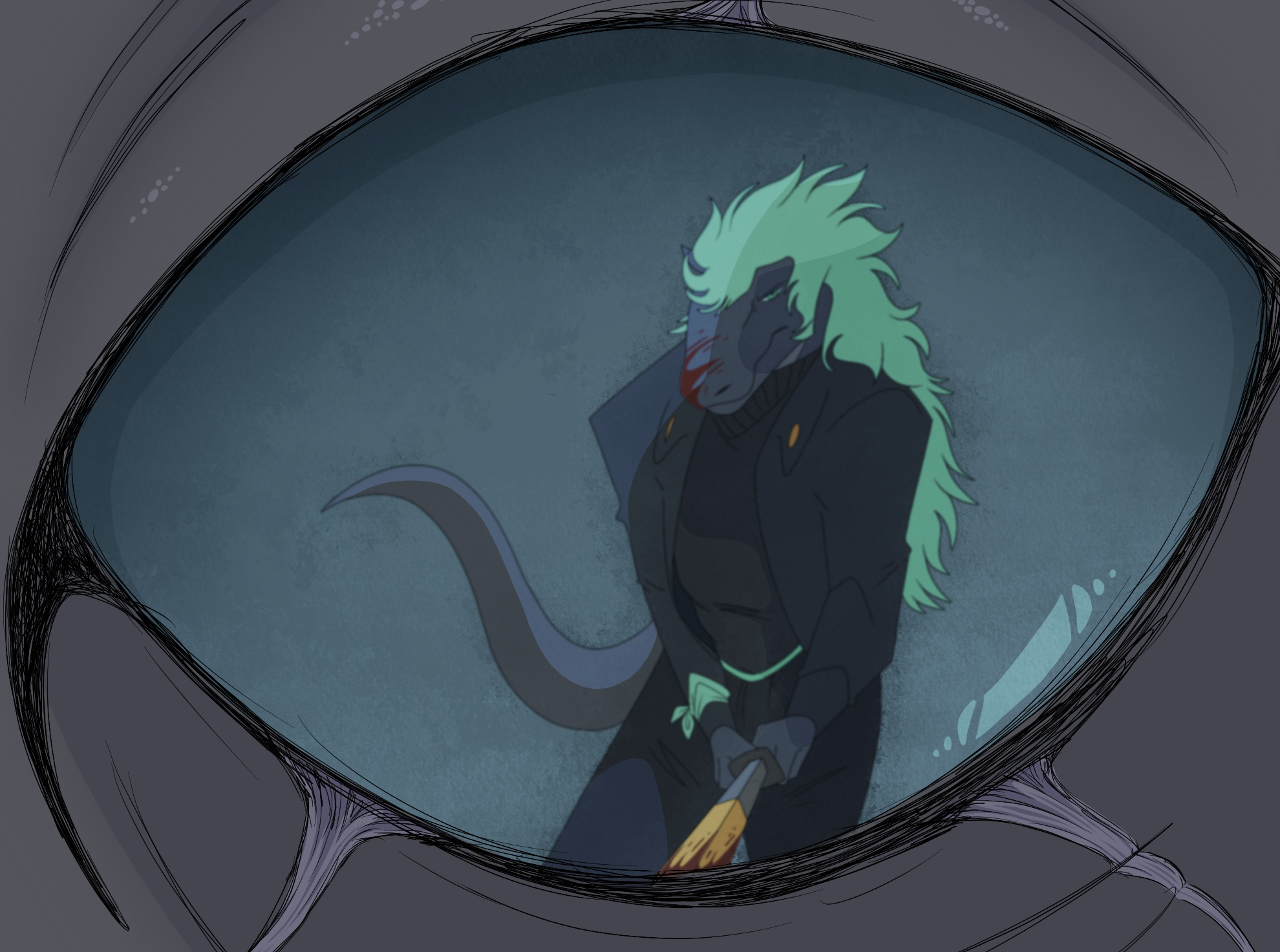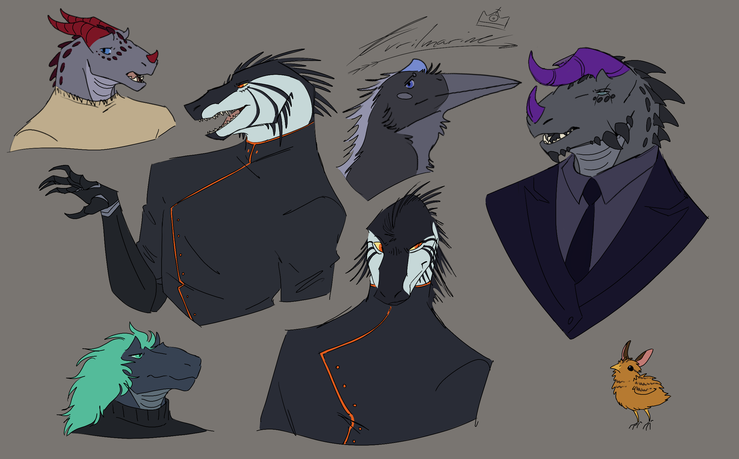 Aqua is a Giganotosaurus Saurian, meaning she posses Dinosaurian qualities. Her body is covered in small dark blue scales, which is usually covered up by her long dark clothes, such as turtle necks and sweat pants. Both her hands and feet are clawed, though she prefers to use weapons anyway. Like most Giganotosaurs, her face is long and narrow, with strong brow ridge over her green eyes. Her head feathers form a long flowing mane of sorts, which stands out with its cyan coloring.