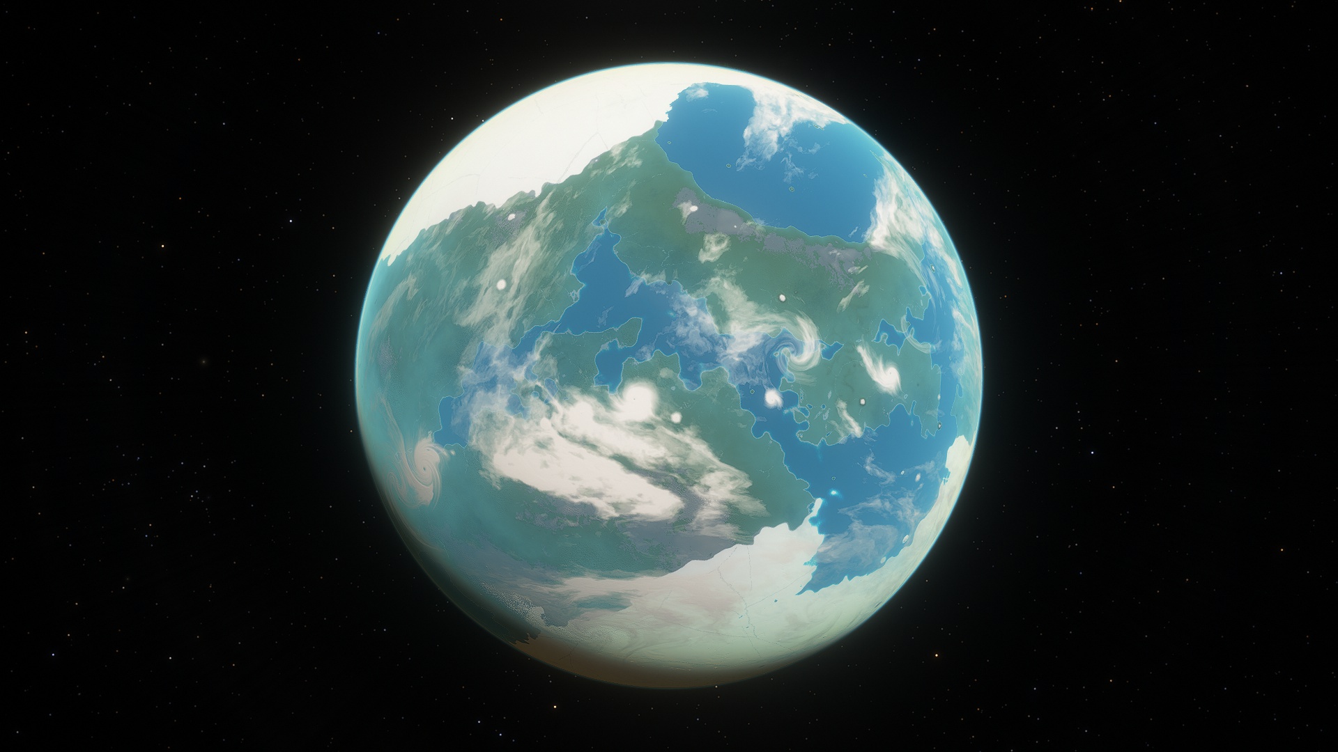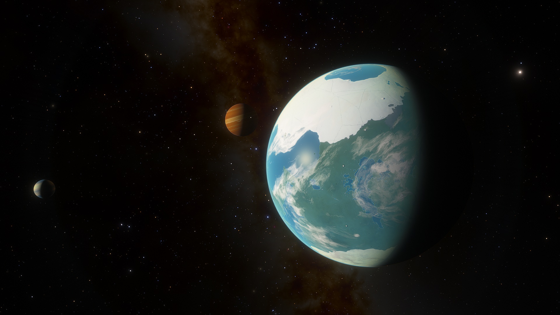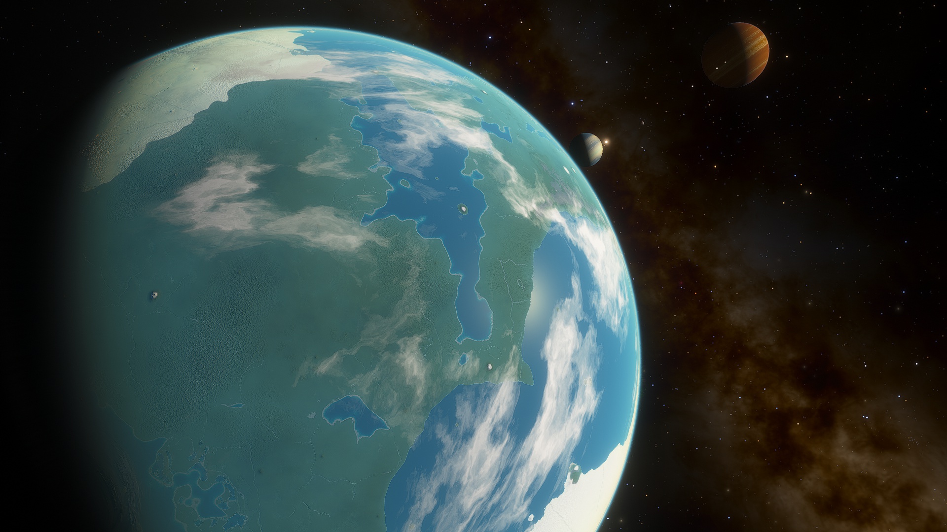 Asudem is a mostly semi-arid, hot planet, currently in the midst of an Ice Age, large glaciers dominate both north and south poles, around their borders, lush temperate wetlands thrive. Near the equator, several tropical rainforests grow. Although the land of this moon looks almost entirely green from orbit, this is due to the density of plantlife growing in the arid scrublands and dry deserts around the equator.