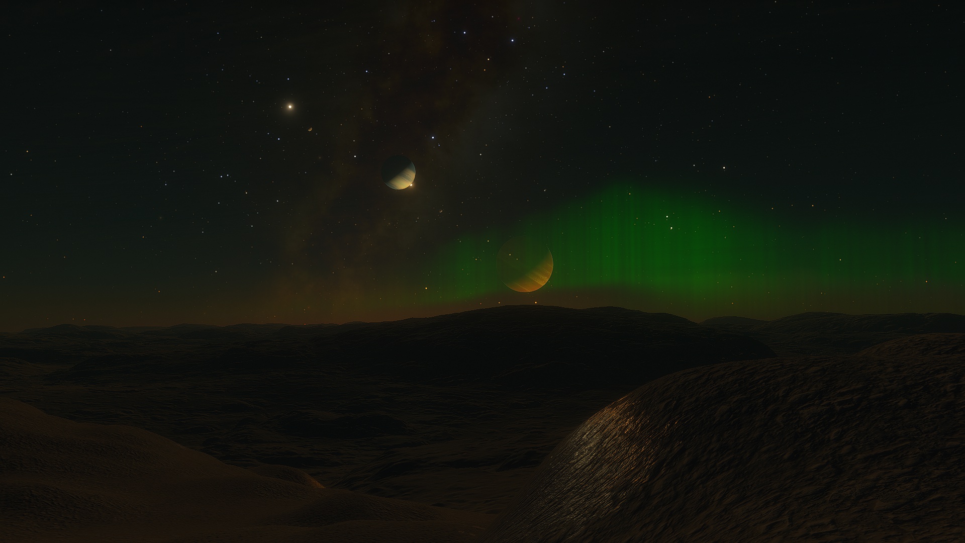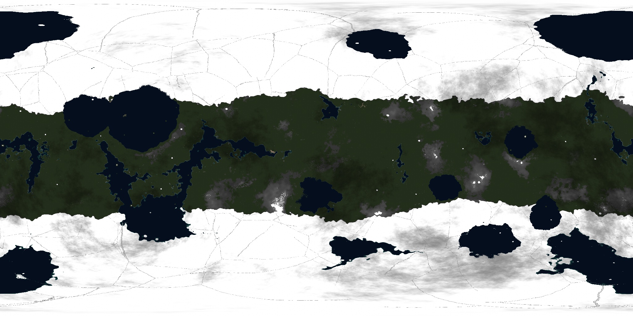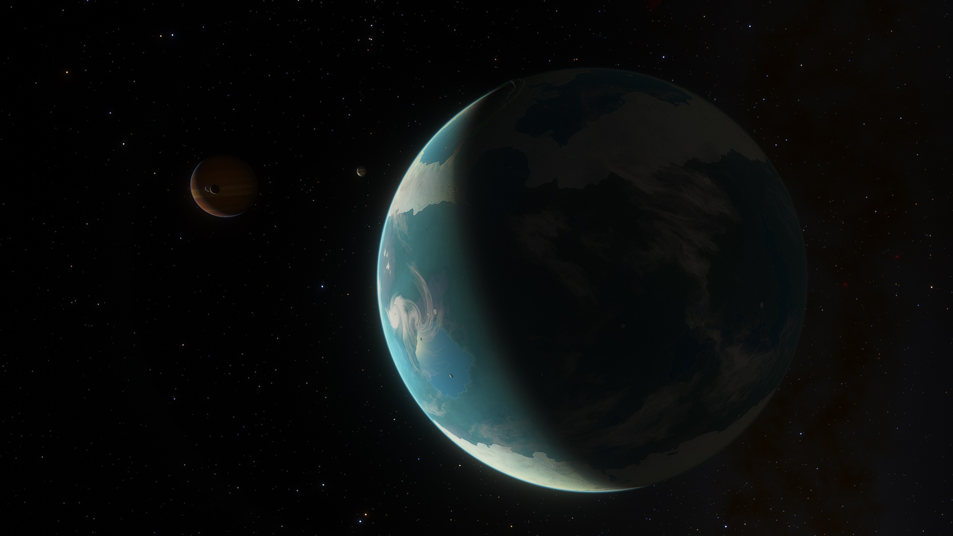 Asudem is a mostly semi-arid, hot planet, currently in the midst of an Ice Age, large glaciers dominate both north and south poles, around their borders, lush temperate wetlands thrive. Near the equator, several tropical rainforests grow. Although the land of this moon looks almost entirely green from orbit, this is due to the density of plantlife growing in the arid scrublands and dry deserts around the equator.