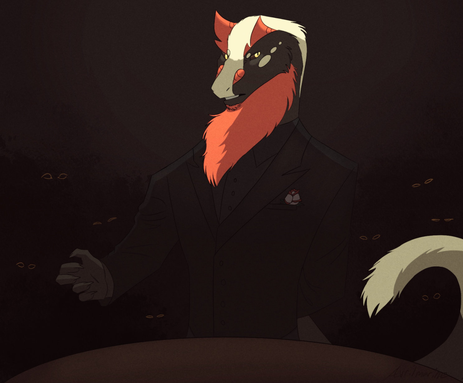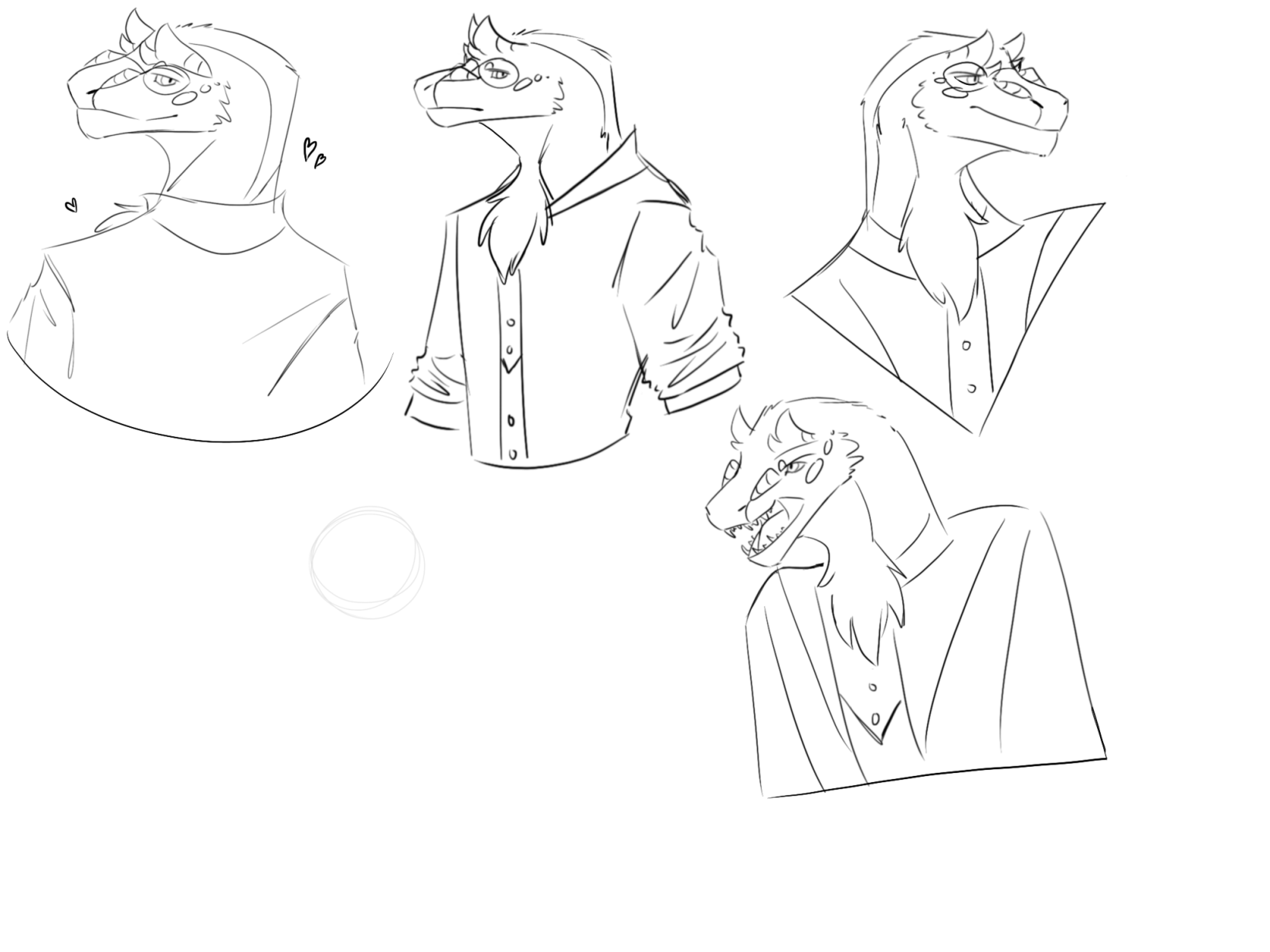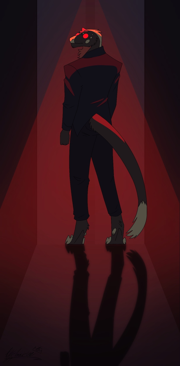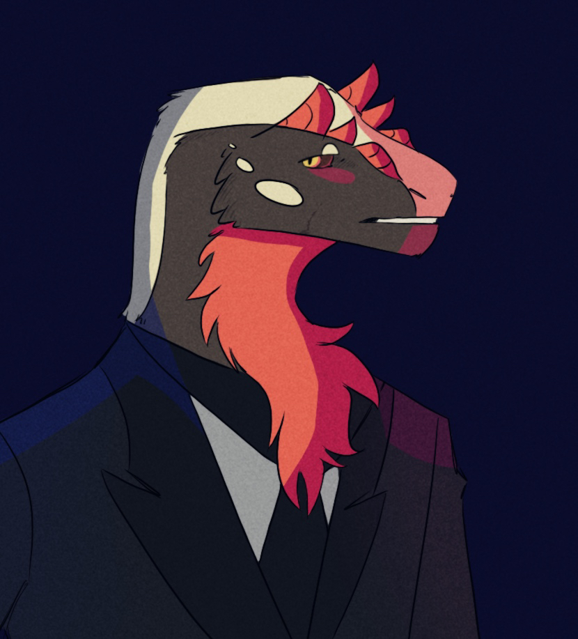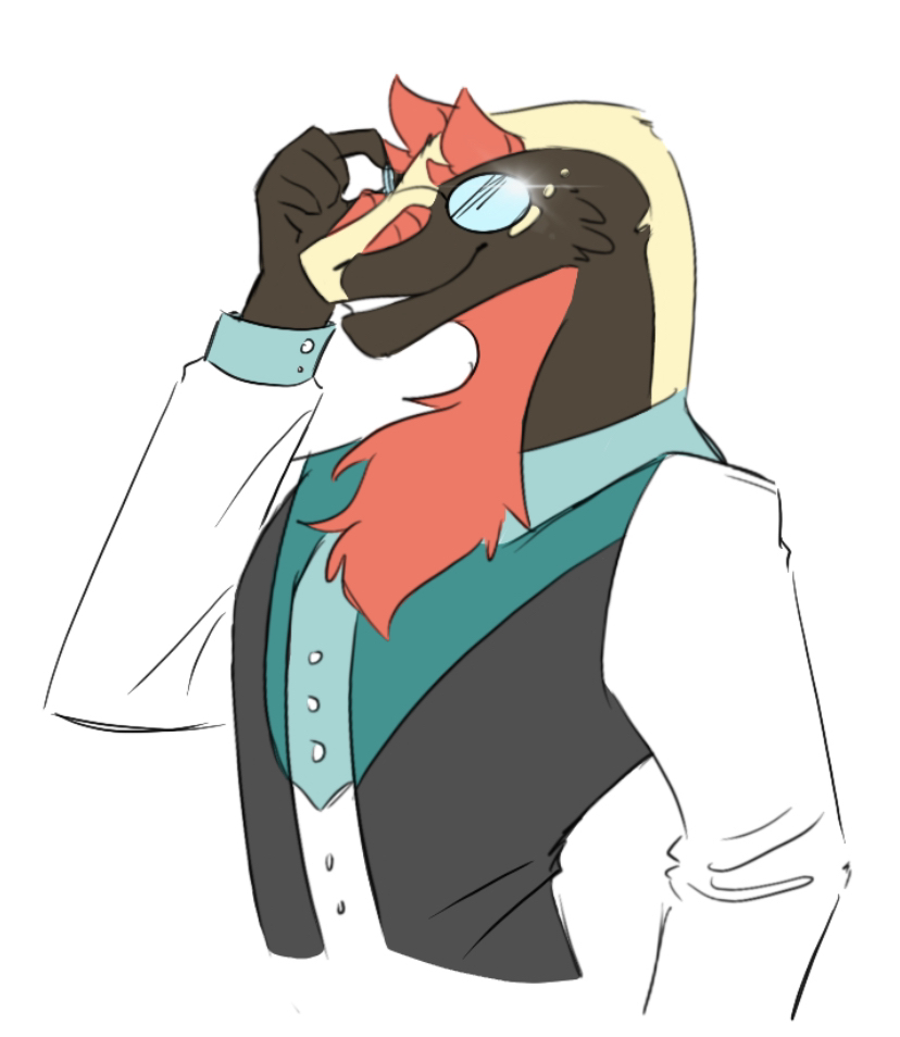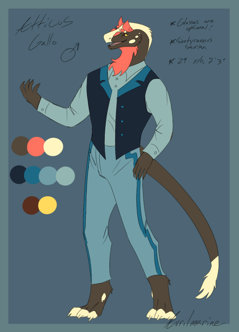 As standard of his Breed, Atticus's body is covered in a coat of long fluffy fuzz, with it becoming almost akin to a Beard or Wattle, with a pair of coral colored Crests rising above his eyebrows. Due to his Vibrant Fur & Clothing, he's often compared the look of Toothpaste, as his coat is a mix of Brown, yellow and Coral, whilst his Suit and Pants are various shades of blue. Speaking of Clothing, he wears a suit jacket, which is typically left unbuttoned, as well as stripped pants, he also possess glasses. His build is lean, with a waist that would put an actress to shame, he also stands tall at 7 feet and 3 inches.