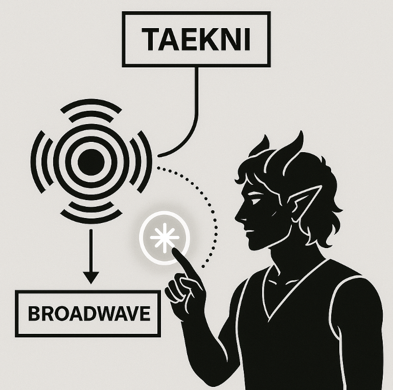 The Broadwave originates from a source currently thought to be in the Abyssreach - That source is the origin of Taekni. When a user casts a Rune, they are in essence telling the Broadwave the effect that they seek to create, and then, the Broadwave manifests it. This is the act of performing the Arcane Art of Taekni - The Broadwave acts as the medium through which Taekni is performed.