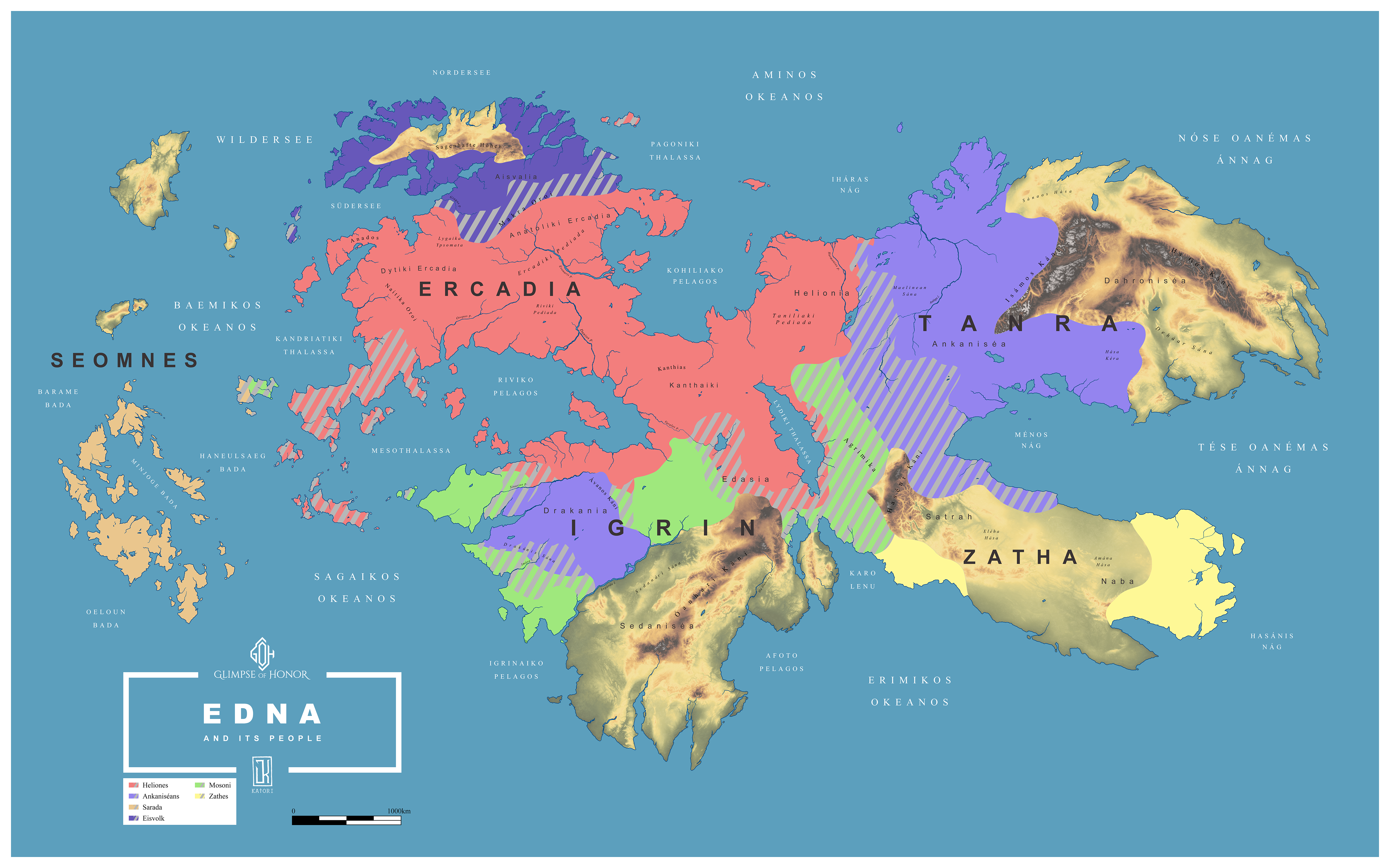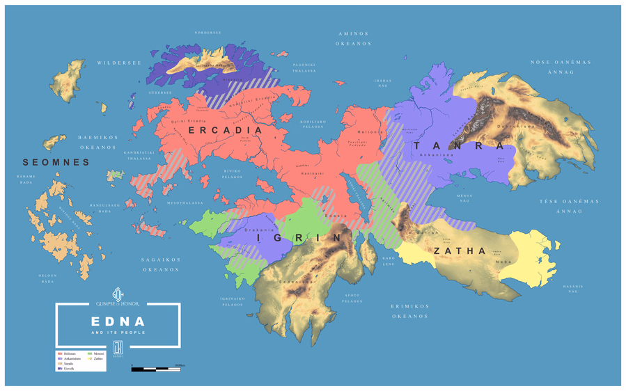 Edna, is an ancient world of unknown origins and forsaken by its creator. The world itself used to be void of time, as days and nights hadn't yet come into existence. It would, however, be forever changed with the arrival of the Gods who in the end created Humans. The earliest signs of mankind in Edna can be witnessed in the western parts of Tanra from which they expanded into Ercadia and Igrin roughly around the same period. Seomnes and Zatha were left unexplored for several thousands of years, due to the difficult environment, such as open seas and desert respectively. As people developed their seafaring skills, those places were inhabited, too.