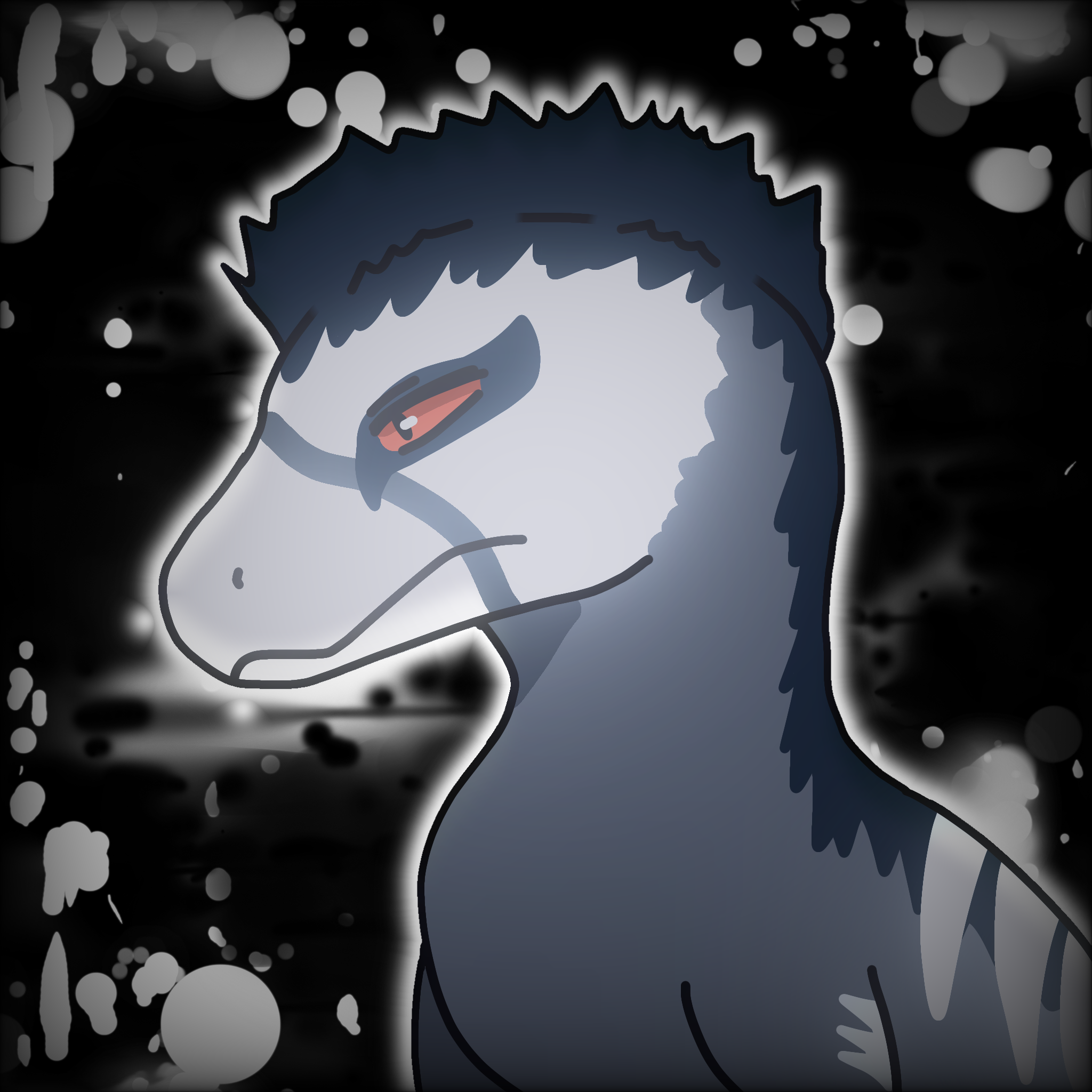 Standing at a measly 3 feet, four inches tall, and 8.9 feet long, Larkspur is the smallest member of apex. Larkspur is covered in mainly gray feathers, though her head and back feathers are black, and her face is white. Larkspur has piercing blood-red eyes, and she usually wears a pair of spectacles on her snout.