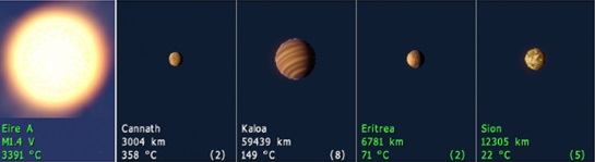 The Eire System is the most important core system ofthe Republic of Sion, where the capital of the nation is located. It is a binary system of the Herschel Space, located in the Lewis Galaxy. The system is made of two suns, Eire A and Eire B, both being red dwarfs. Eire A is orbited by two planets with live, Sion and Eritrea. Eire B has no planets with live, but has a suitable desert planet called Varos, which harbors a big amount of population.