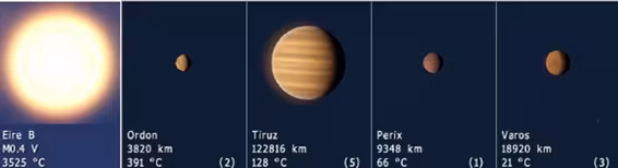 - Tiruz: A big Gas Giant, it has many orbital stations on its surface. Its economy is mainly driven by gas extraction and chemical manufacturing. Its the second most populated planet in the system. It has a total population of 60 Billion.