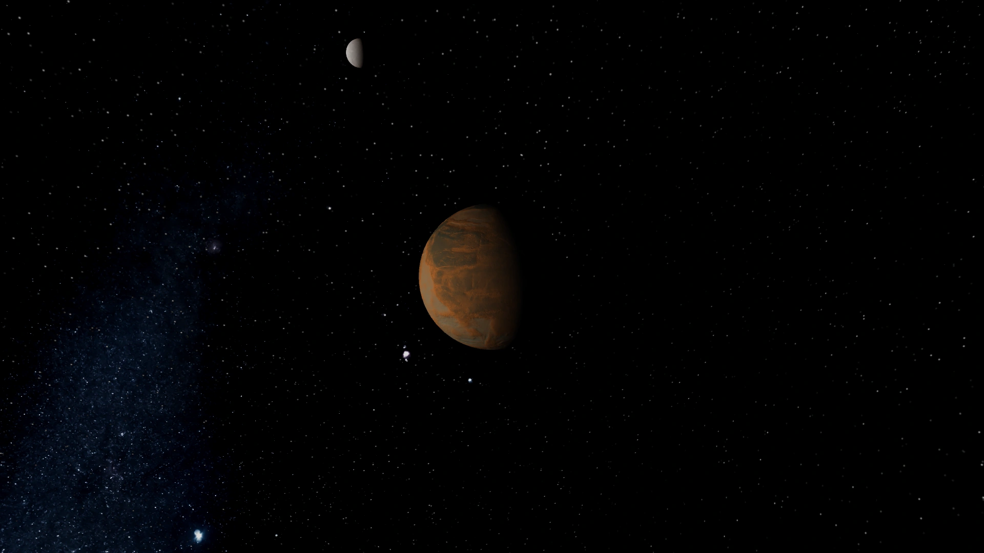 Due to its size, Erdath's sphere of influence is filled to the brim with a massive and great variety of objects, ranging from its twin large moons of Verto and Lirtso to the innumerable rocks making up the Erdathian ring system, to the few outer captured asteroids, to the vast number of artificial habitat stations which exist in its orbit. From afar, its ring system is the most visually striking set of objects within Erdath's sphere of influence, but its two moons add up to more mass in total.
