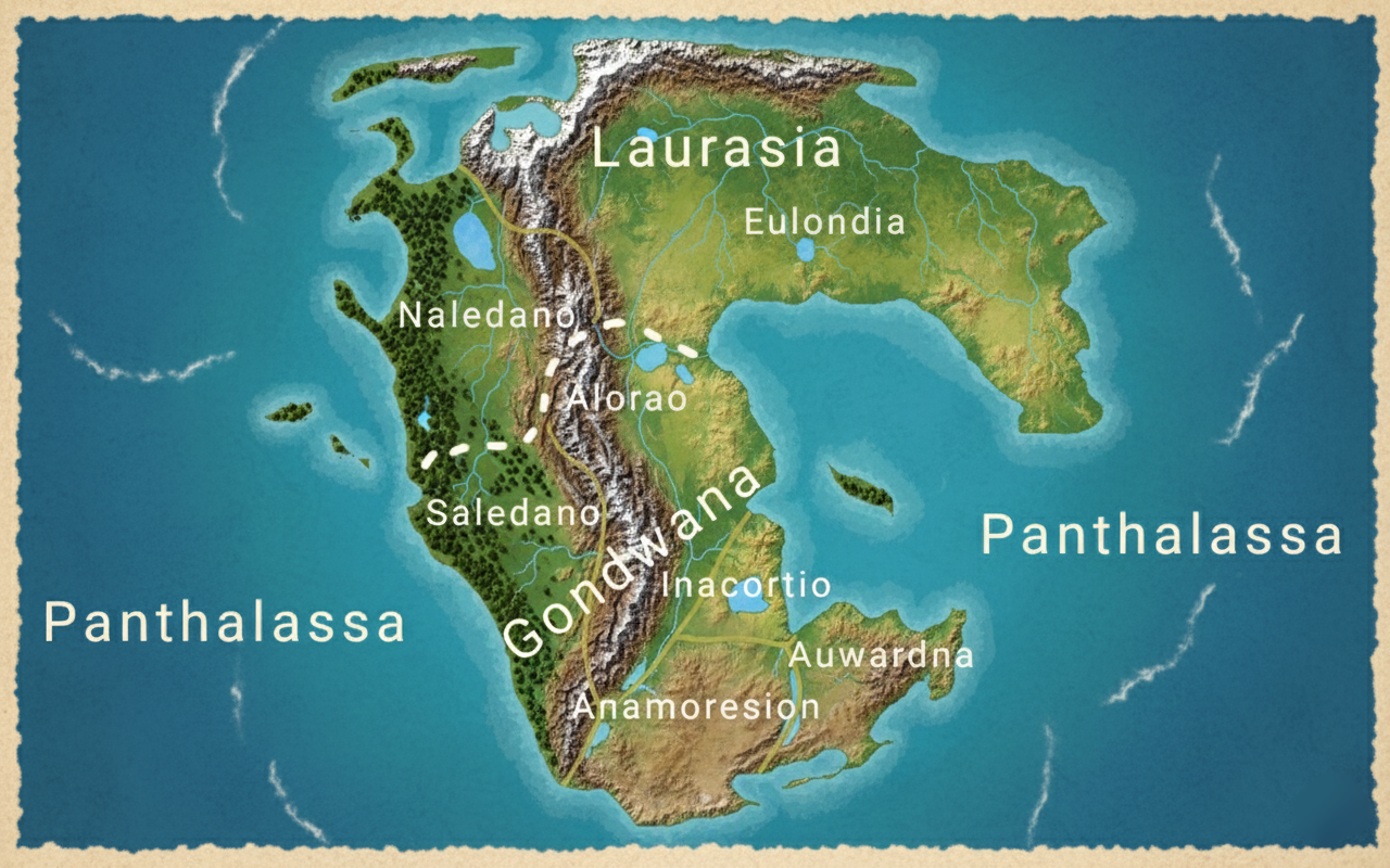 The face of the planet remains locked in an eternal age: the great supercontinent of Pangea, never split by drifting plates, never consumed by oceans. Its forests stretch unending from pole to pole, its mountain ranges rise like the bones of gods, and its swamps are older than memory itself. Creatures that on Earth would have vanished millions of years ago still walk its soil, their bloodlines uninterrupted, their empires of flesh eternal.
