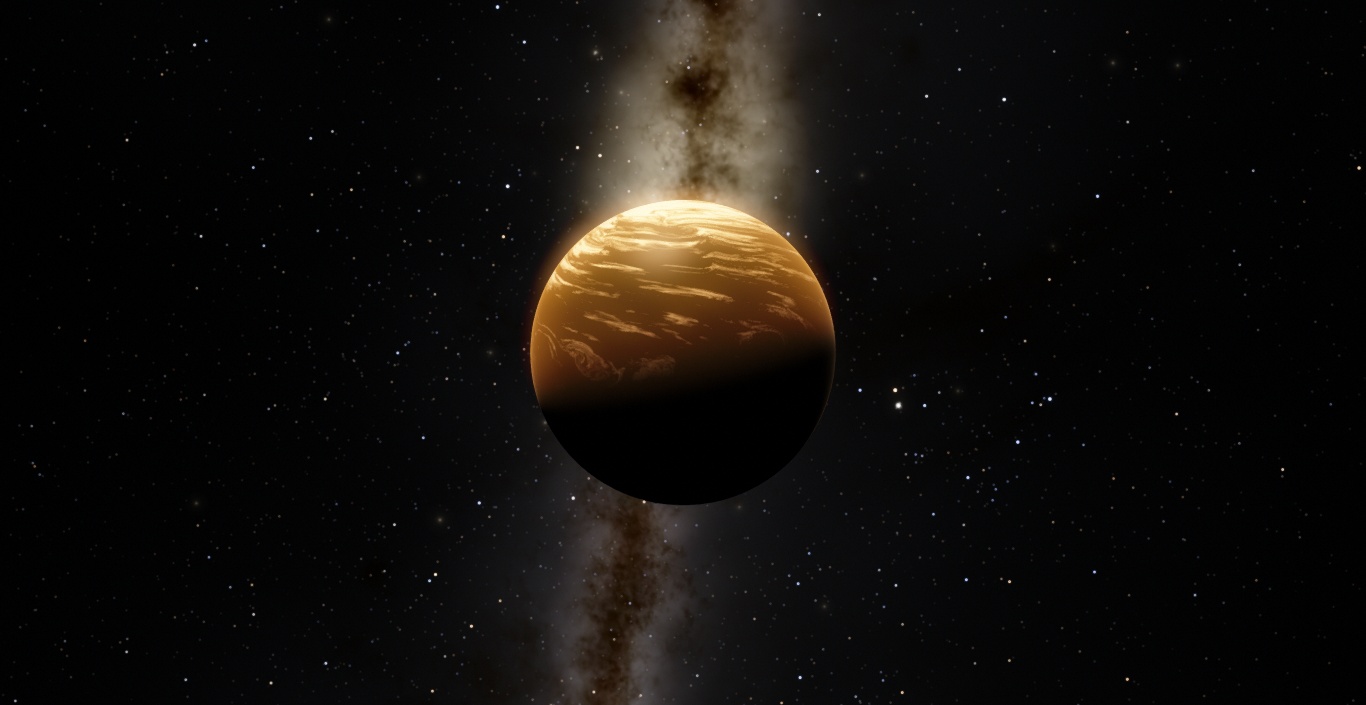 The surface consists of a world spanning ocean with a faint, low hanging fog above the water due to the extreme humidity. The planet also has an enormous hurricane on the daytime side due to being tidally locked. It has no moons.