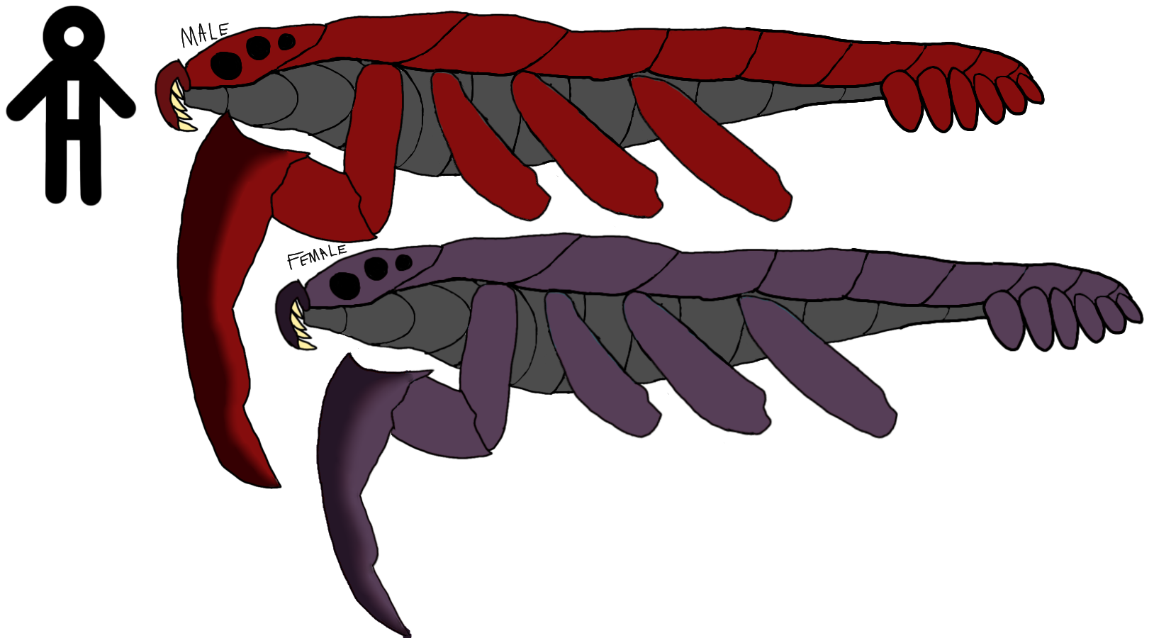 Grand reapers are one of the planet’s largest marine inhabitants. Males having a dark red top side with a dark grey underside while females have a muted purple top side. They have scythe-like forelimbs along with a row of flippers and a wide, flat tail.