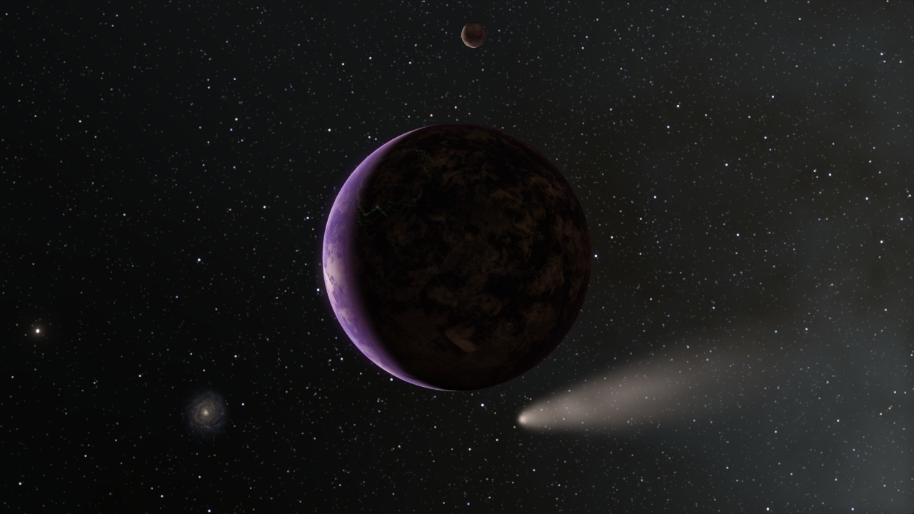 A view of Igolath with a comet and the Andromeda Galaxy in the background.