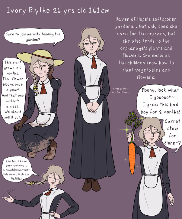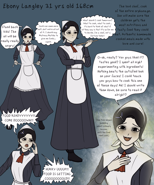 However, she was rescued by two soldiers who were patrolling the streets and heard the noise, putting an end to her living nightmares As she landed in the orphanage, she went into a depressive state, void of purpose nor goal 3 more years, she'll be kicked out of the orphanage and onto the factory, if a factory accepts her as an employee at least, but unlikely for she is blind, and will only prove useless and a hinderance to any workplace. She's an older child, and no one wants to adopt someone her age, let alone with her disability With those factors sadly in mind, she—with the help and emotional support of the orphanage itself, gave herself purpose anew, to become a good mother someday, but how does one become a good mother if there's no one to look up to? She became the orphanage's unofficial little caretaker, helping around and tending to younger kids.