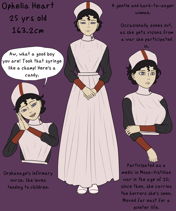 She moved from the far west of Mostia to the far east, in Prosperway city, to find purpose and to nurse people there, luckily landing a job at the orphanage where she resides now