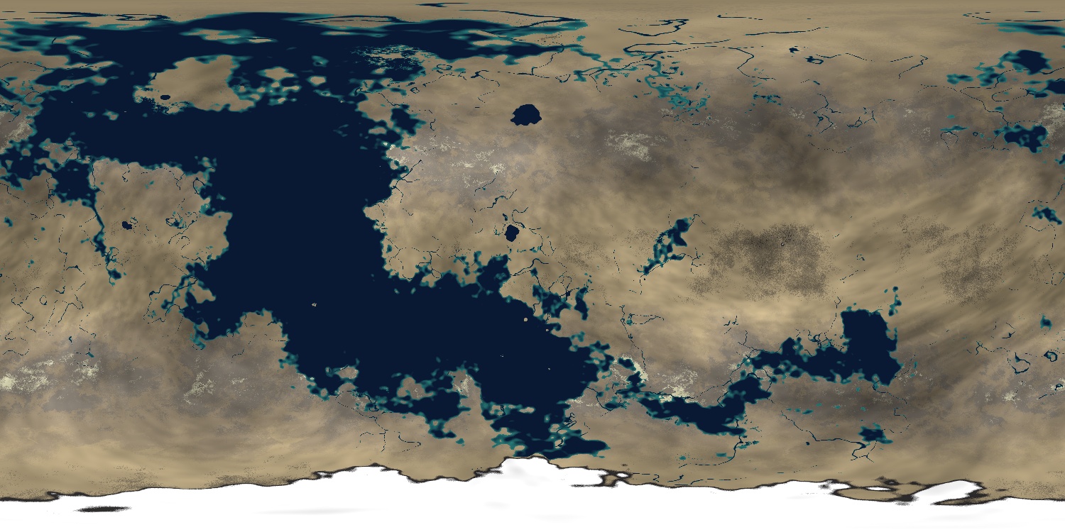 The planet has seven moons, one of which is a temperate D-Class moon which gives the ocean tides. Along with the rest of the system the planet is 11.7 billion years old.