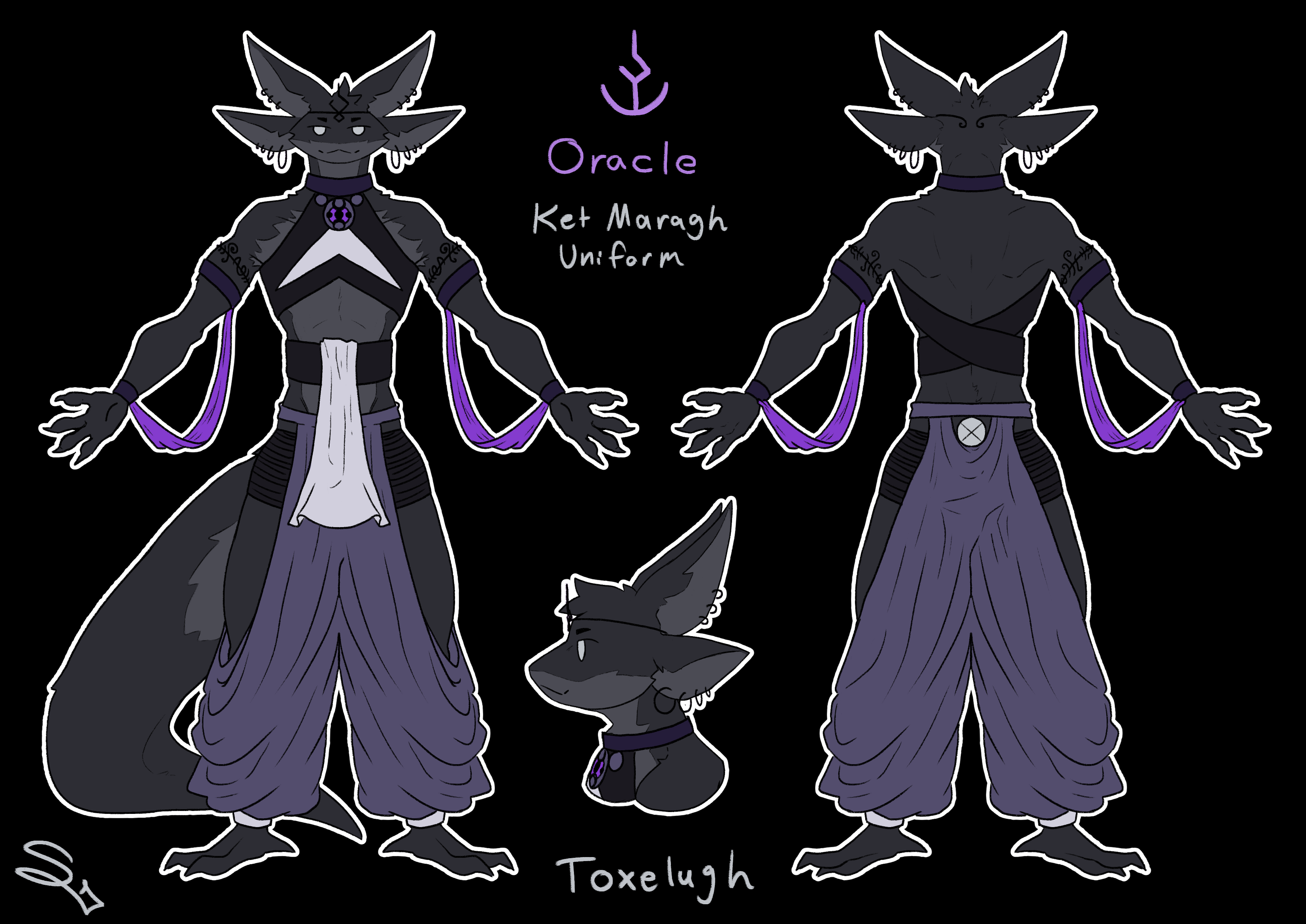 Tongues may, though this rarely occurs, go on to become the highest rank of priest, the Oracles. There are less than a dozen Oracles at any given time. They are the ones said to be capable of fully communicating with the Great Beast, directly informing Her immortal soul of the state of Her Archipelago. The Oracles have final say on interpretation of Scripture and have been known to deliver prophecies. They are the heads of the church of Ket Maragh, and have a congregation hall in the Temple of the Moon. Their outfits are the least standard of any Ketem priest, as Oracles tend to theme themselves after their particular flavor of divine revelation and personality.