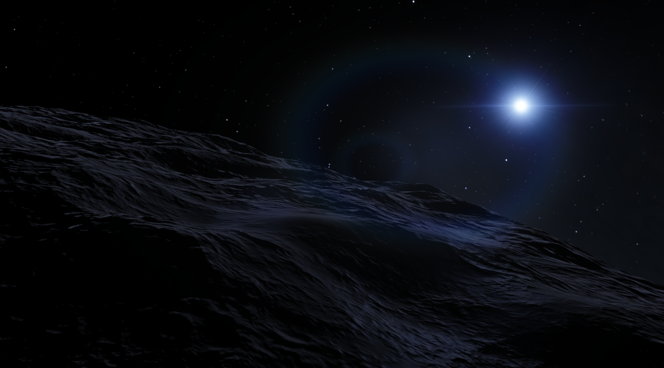 The 17 minor asteroids in orbit around the planet have not been discovered by the Ki'Larthikians, so it was determined these would be ignored. However, the three major moons, called "I'gni"(1.3), "Kar'thus"(1.2), and "Yomm'a"(1.1) deserved some exploration. the first two seemed to be tiny ice worlds just 0.03 of Earth's diameter. These seemed to be covered in thick sheets of water ice, and may have a liquid interior thanks to the influence of Ki'Larthik. No life has been detected on either moon.
