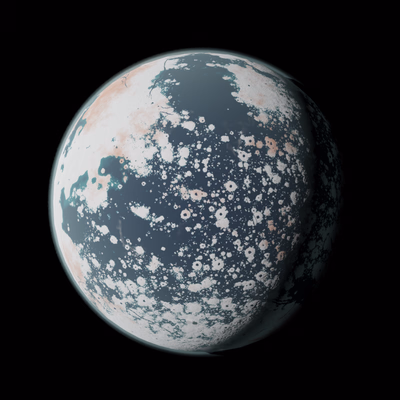 The ice world is peppered with gargantuan craters, a leftover from it's intense primordial bombardment era, while colossal ice sheets cover juvenile continents. Massive databanks are stored deep in the permafrost, ideal for cooling the ceaseless servers. The dominant life form (besides the Aeno) are intelligent beings known as the Icehuggers. They scrape the top of ice sheets for microscopic plankton and nutrients. . They are similar in appearance to their stellar cousins, the Star Rays, who roam the surrounding star systems, slowly digesting cosmic microparticles.