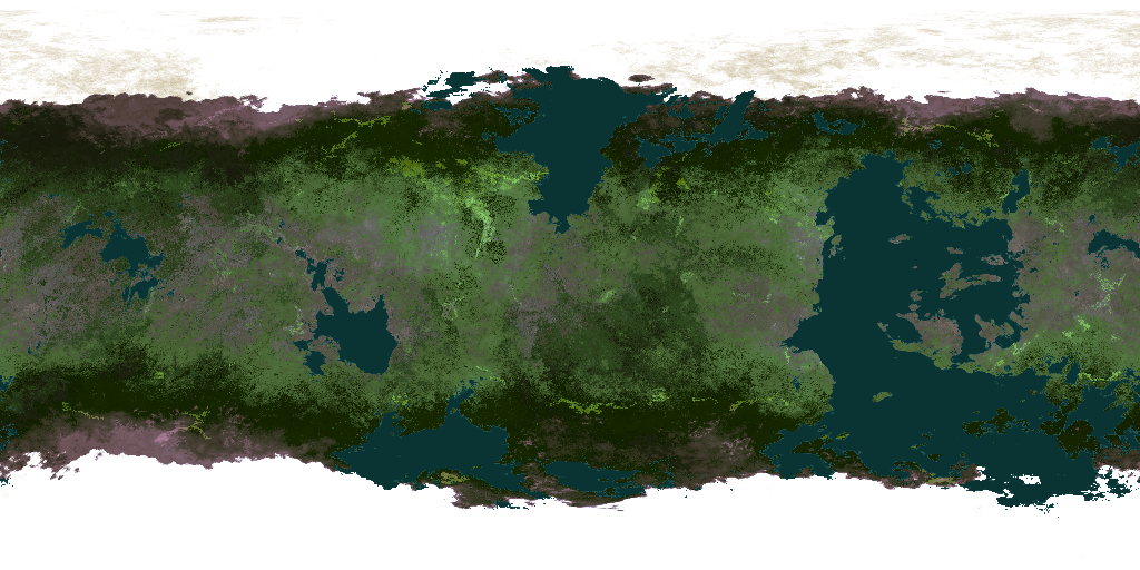 Due to the extremely low axial tilt of around half a degree, Lanoo sees no seasons, and is instead accorded "ecoregions". The mean temperature even at -20 centigrade, makes the region 10 degrees north and south of the equator akin to tropic environments. Indeed, this region is lush with life, and there were vacation spots on the shores of some of the crater lakes in the region. From 10 to 40 degrees from the equator is considered temperate. Vast forests too cover this zone, although the trees here tend to be coniferous with a few decidouous trees mixed in. From 50 to 70 degrees from the equator, tundra abounds, and most flora here are low-growing shrubs. This is also the least populated ecoregion on the planet, due to scarce resorces. Finally, from 70 degrees to the poles, the landscape is completely taken over by icecaps.