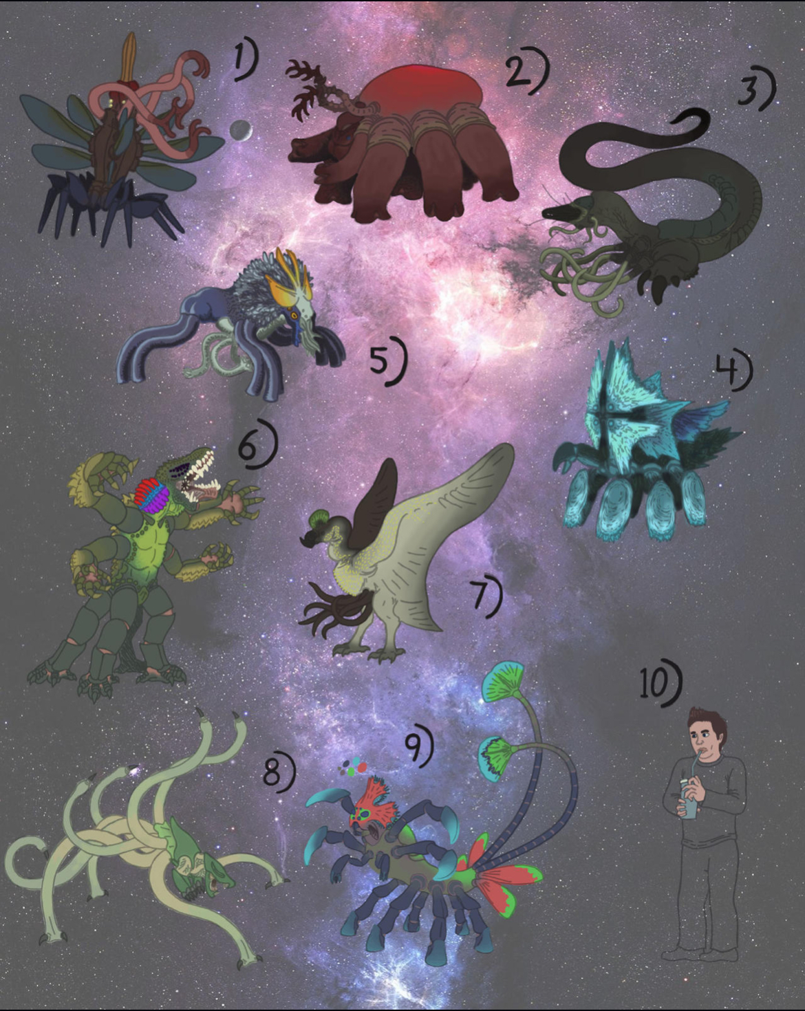 A variety of Sapient Races 1. Ja-hookump, 2. Harg-gog, 3. fazh HUuu, 4. doOon 5. Caf-kah 6. Dayjudna 7.Fliixiz 8. Draurgen 9. Aurah-dug, 10. Human (Drawn by Timoshauru5-VII on DeviantArt)