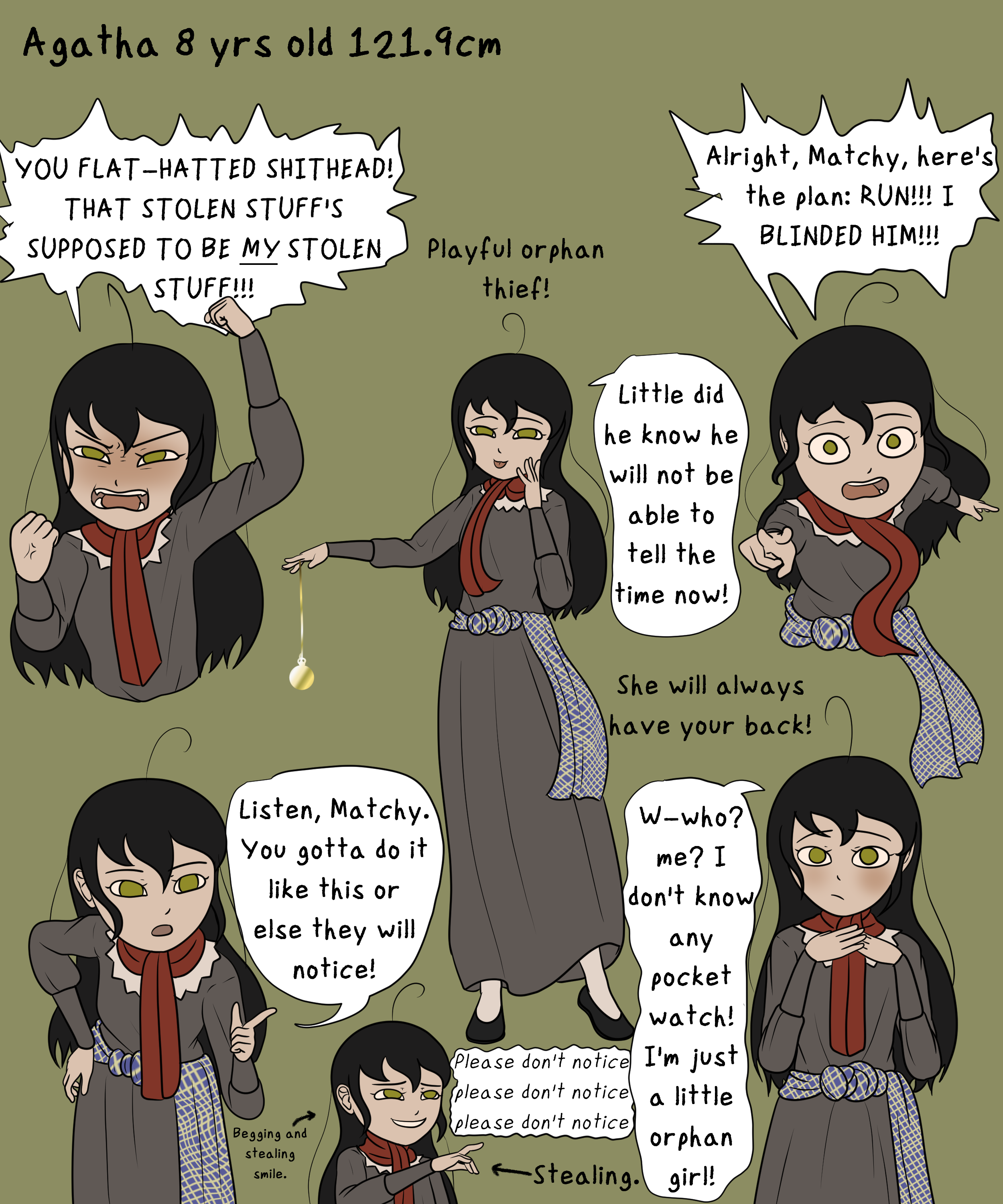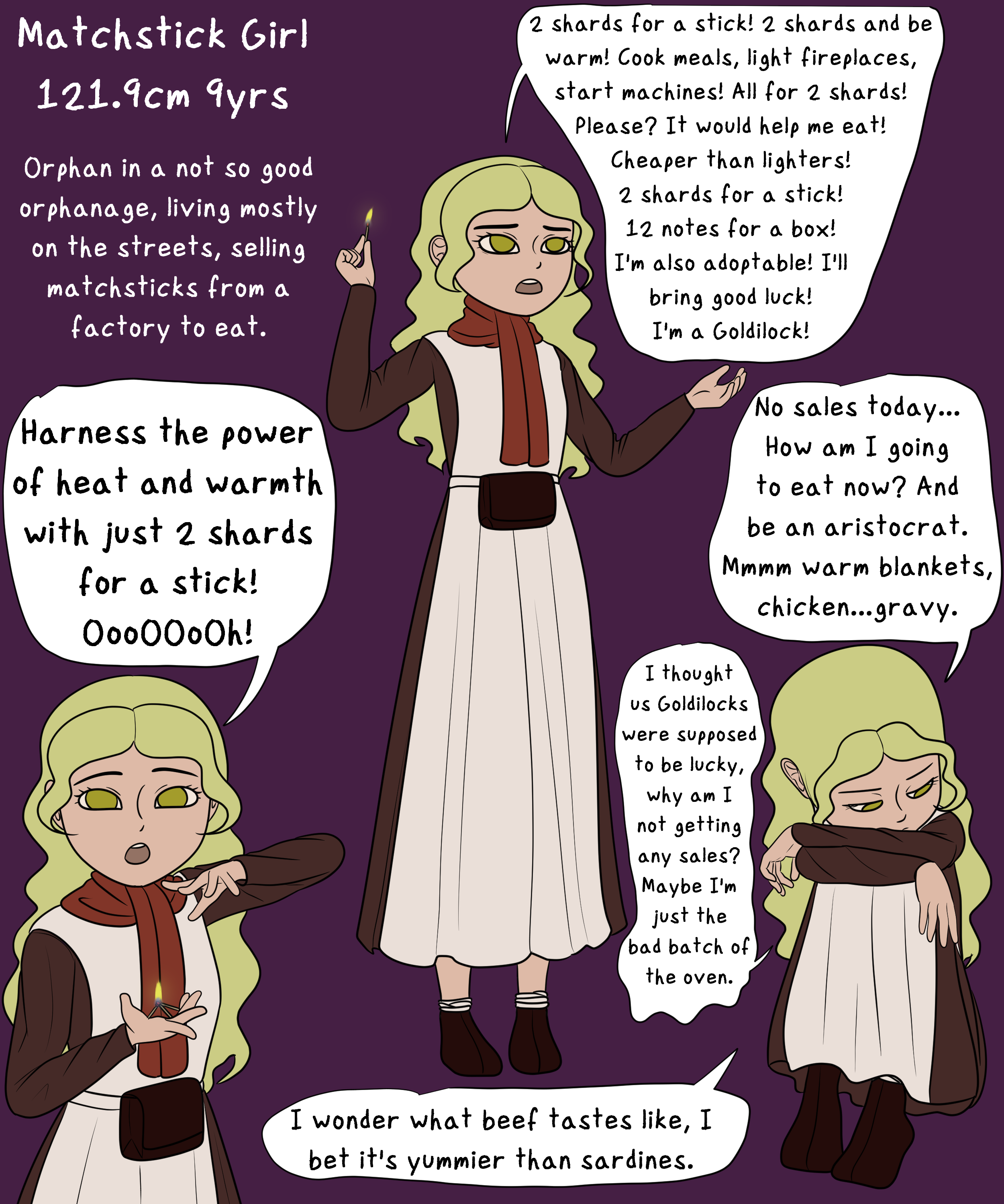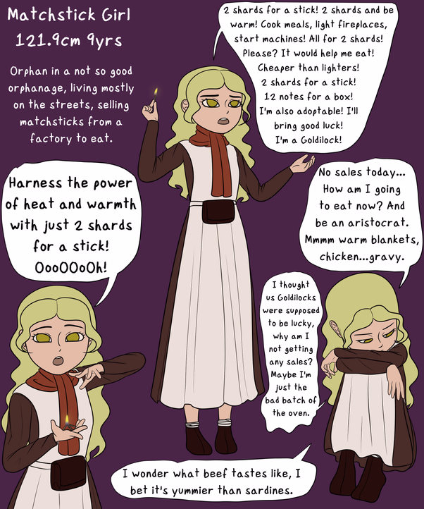She's from a poorly run orphanage and is met with bullying and further abuse from within it in Prosperway city. As she run away, she is picked up by a small factory that makes match sticks where she's tasked to sell them. The more she is able to sell, the more food she could have for today. She lived comfortably inside the factory on the hard brick floor, but she has to keep selling if she doesn't want to be kicked out, and she is only allowed back inside if she have sold 20 boxes, but that's such a hard thing to do for such a little girl, so she essentially sleeps on the street, near or in front of the factory. One day, she promised to herself that she will do anything she can to someday be a high-class aristocrat. A high dream is impossible for a tiny girl for her to ever reach, but that dream help keeps her going