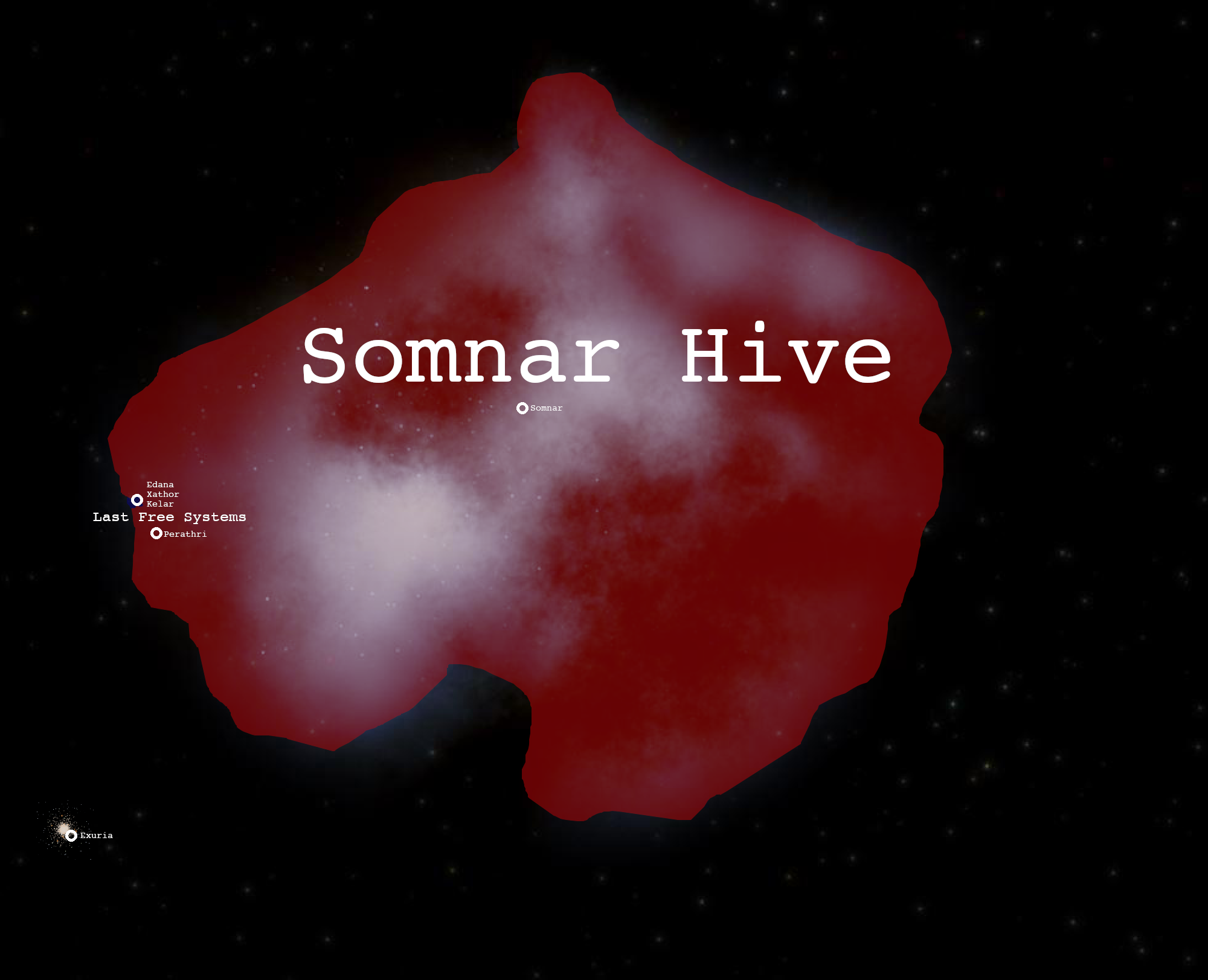 Outer Myrmidan primarily contains the other nations surrounding the Hive and holding it back, although half of the region is already controlled by the Somnar Hive. The largest of these nations was the Corroloa Empire before it was consumed by the hive, but its place has been taken by the Coalition of Free Systems just beyond it.