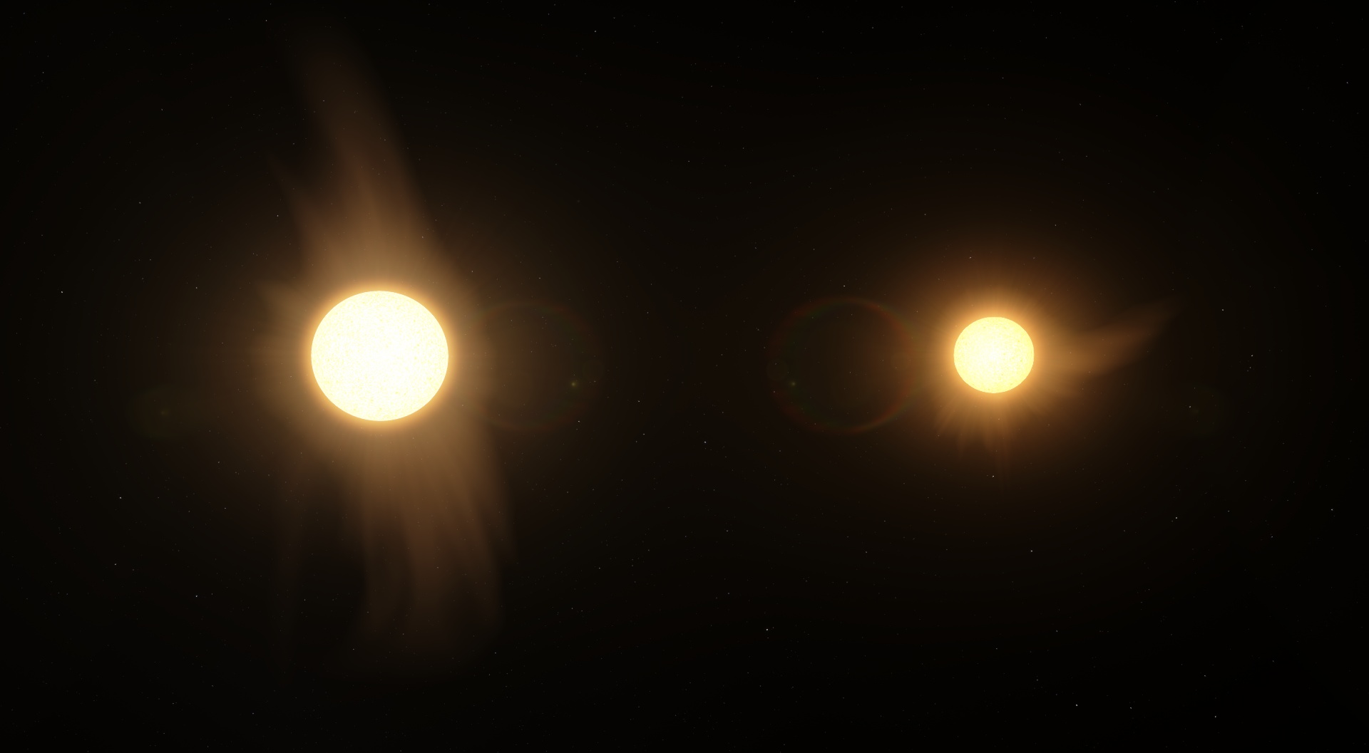 linktext=Two stars orbiting close to each other: K-Dwarf and M-Dwarf with nine planets and an asteroid belt in orbit.