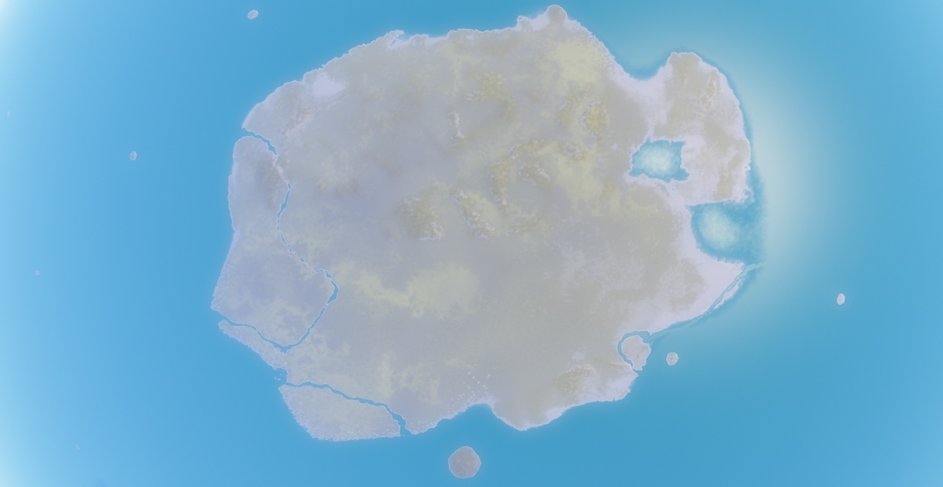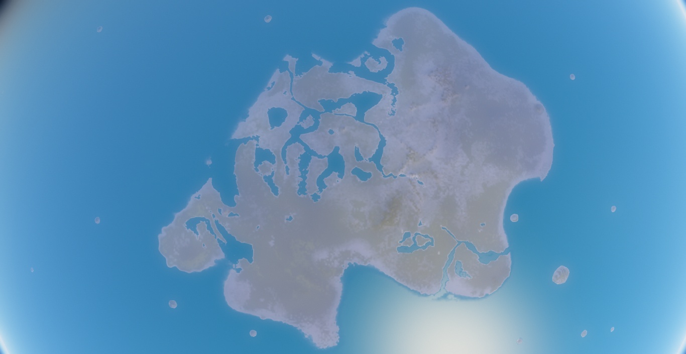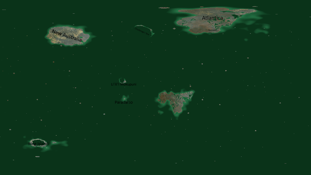Pacifica has two main continents while the rest is just small islands. Several darker patches can be seen from space which are massive craters that are theorised to have been caused by ancient impacts. Volcano islands dot the oceans and all of them are geologically active due to the moon's relatively young age.