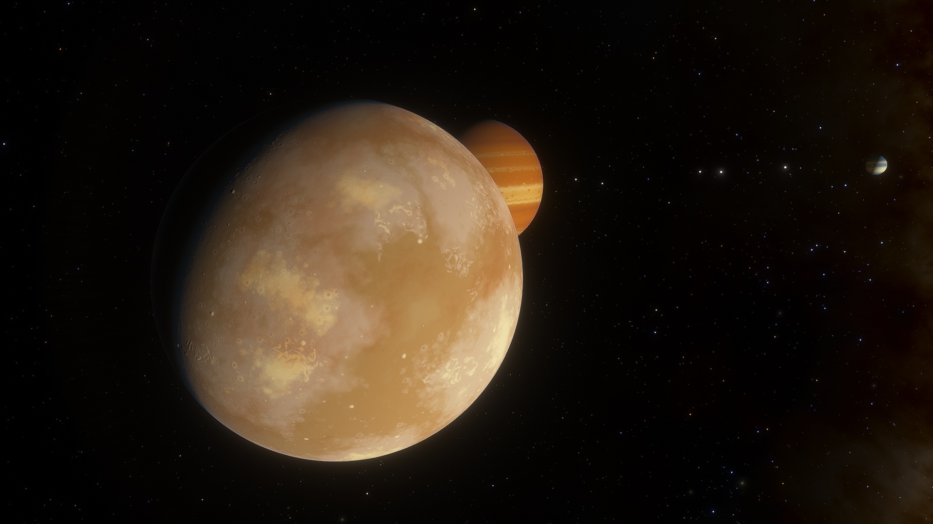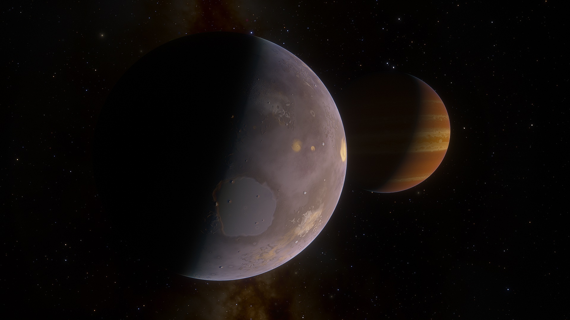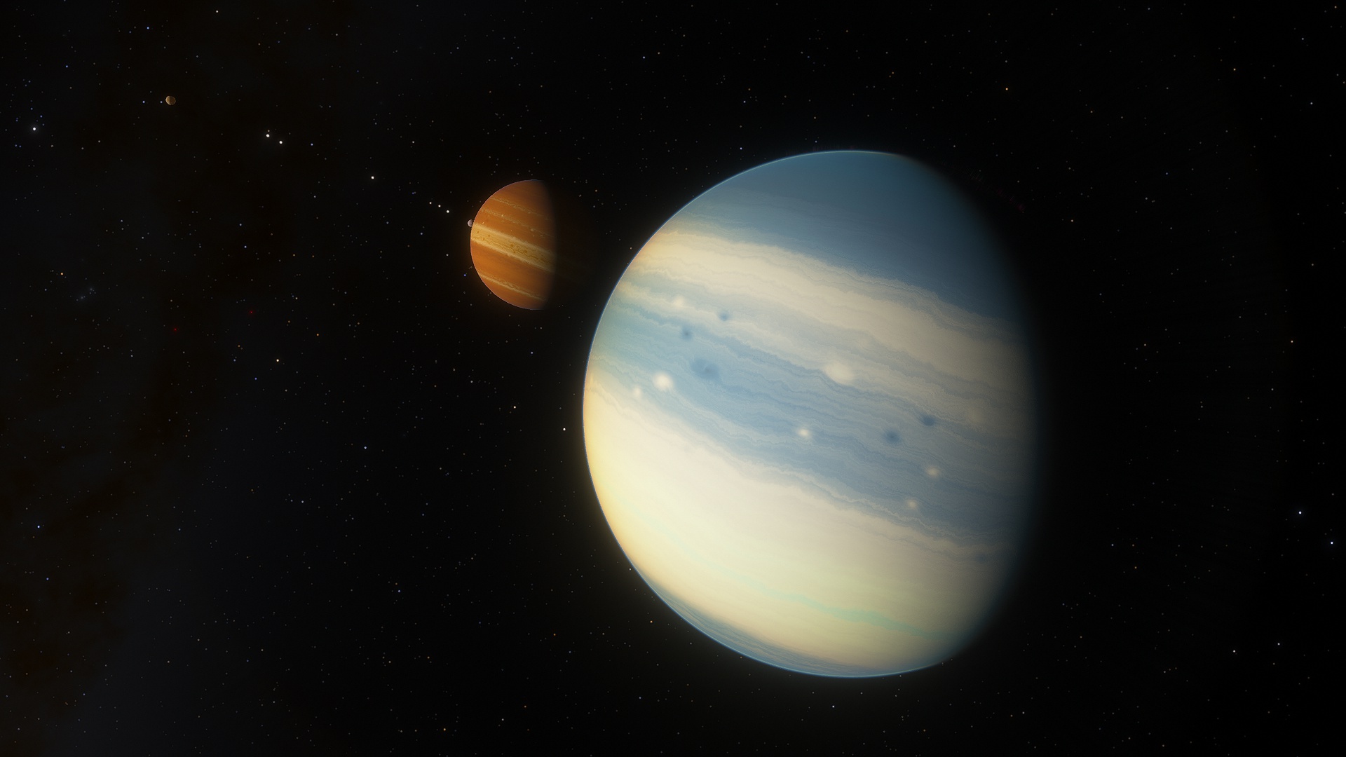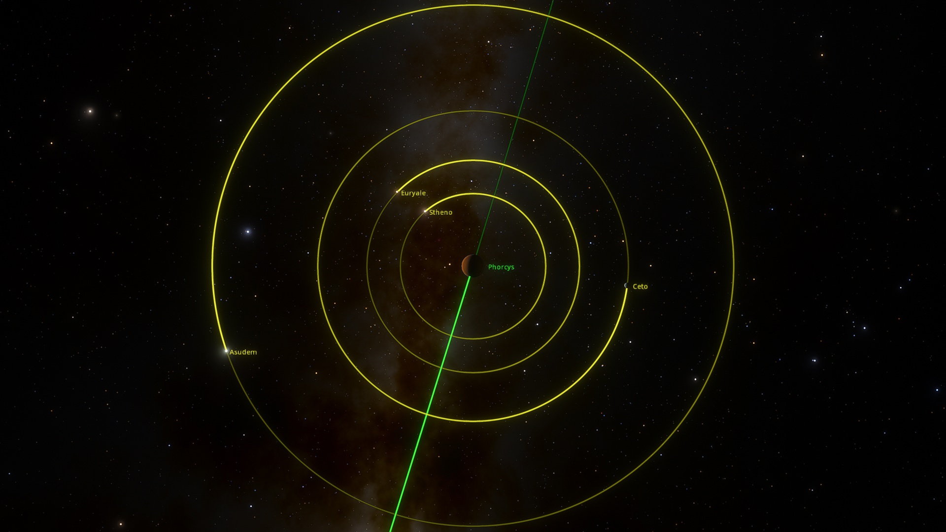 Phorcys in a gas giant in a semi-binary orbit with Ceto, with which it shares three additional moons; Asudem, Stheno and Euryale. While the two bodies do not orbit each other in a truly binary sense, the large size of Ceto tugs on Phorcys as it orbits, causing the latter to wobble and sway as Ceto proceeds around it. While Stheno and Euryale are uninhabitable, Asudem is a moon teaming with life, likely in part to it orbiting far outside of the radiation belt of Phorcys.