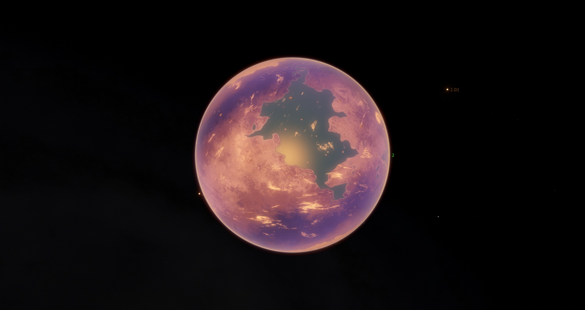 Purpura is a E-Class terrestrial planet in the Rubrum system, and is home to a variety of sea creatures, (such as the Uident) and some amphibious land creatures. It is the second planet in the system, has 3 asteroid moons, and has a temperature of -16.2 degrees C. It's atmosphere is almost entirely CO2, with some O2, and has an atmospheric pressure of 0.651 atm. It has a diameter of 6621 km and with a gravity of 0.49 g. It has a rotational period of a slow 7.510 days, and a solar day of 22.529 days.