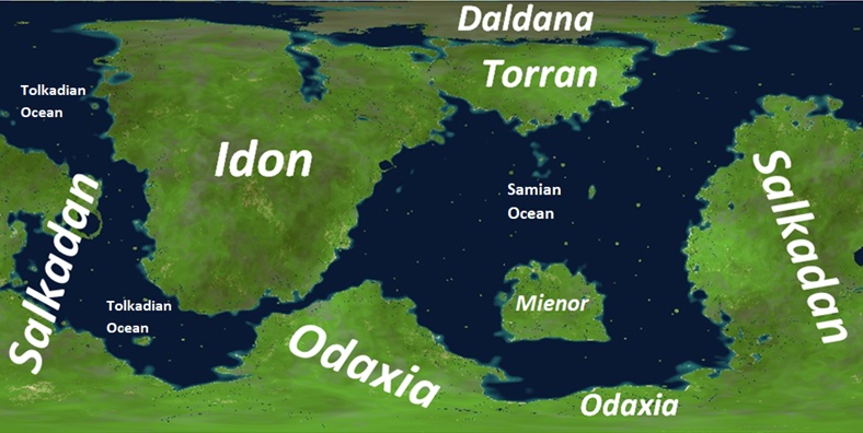 The Planet has 6 continents, Idon, Salkadan, Torran, Daldana, Mienor and Odaxia. Although Odaxia and Salkadan could be consider subcontinents of a Large Continent and merge into one. Rhea has two Oceans: the Samian Ocean, which is large and a busy trading hub between Mienor, Salkadan, Odaxia, Torran, Idon and Daldana, while the other one is the Tolkadian Ocean, which is narrow but with a very rich abundant life, between Salkadan, Idon and Odaxia.