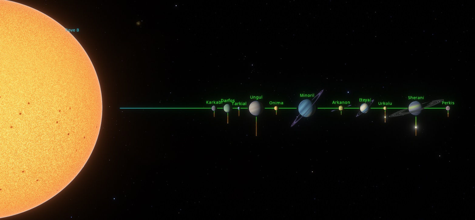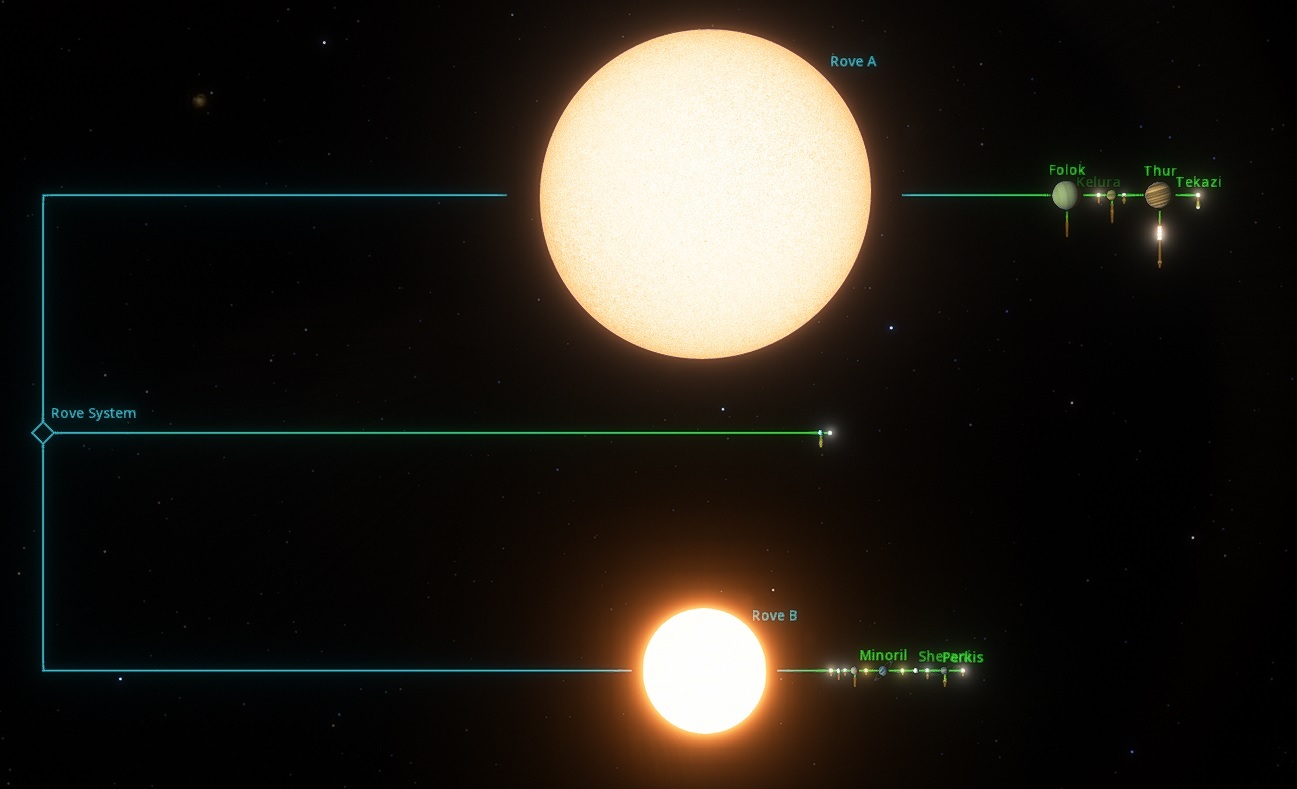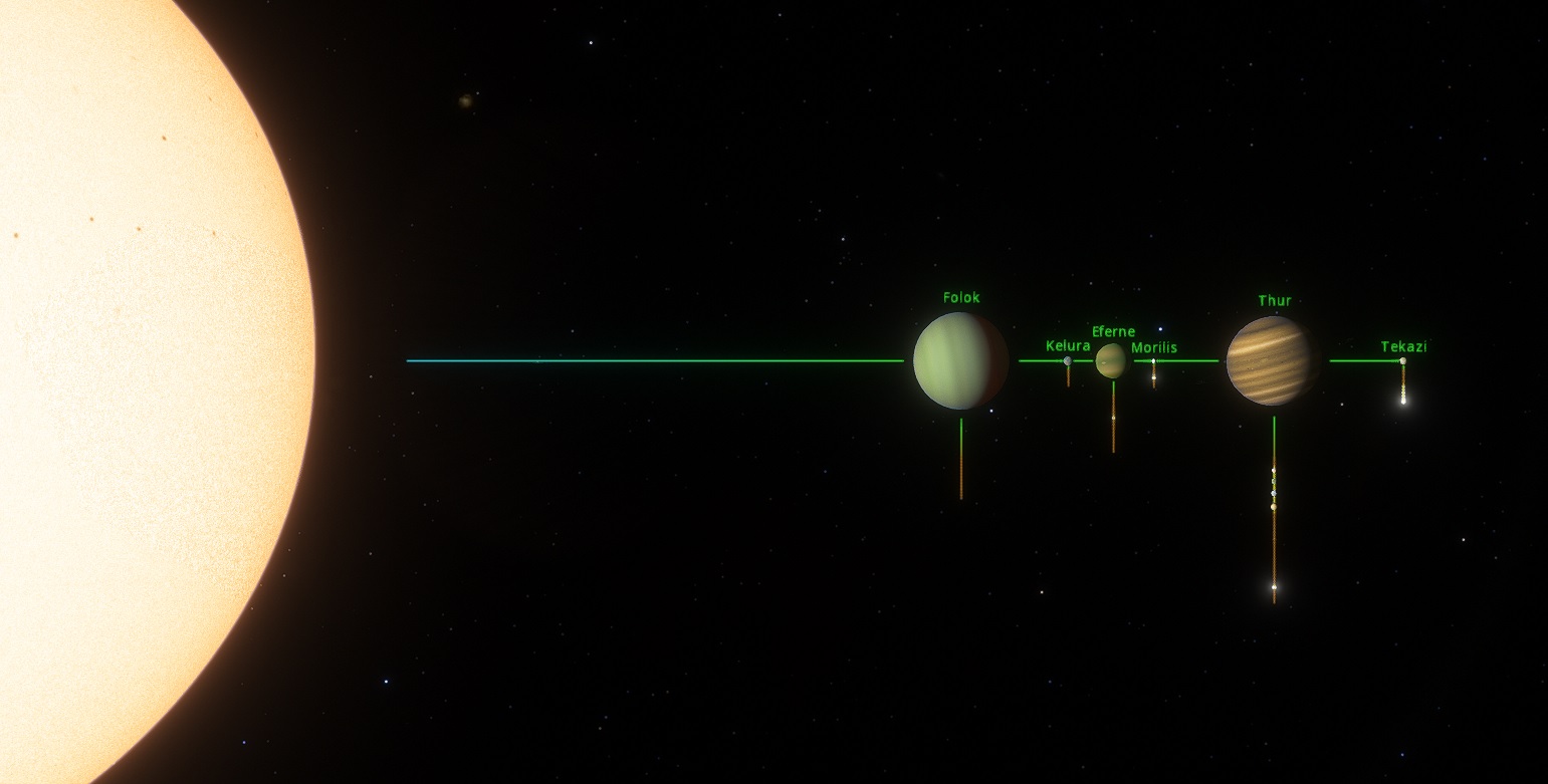 This warm sun has made most of the system really hot, most specially the Gas planet of Folok which has warm gases orbiting around making mostly an uninhabitable place (even for domes). Out of the 6 planets orbiting Rove A, 3 are gas giants and 3 are rocky worlds.