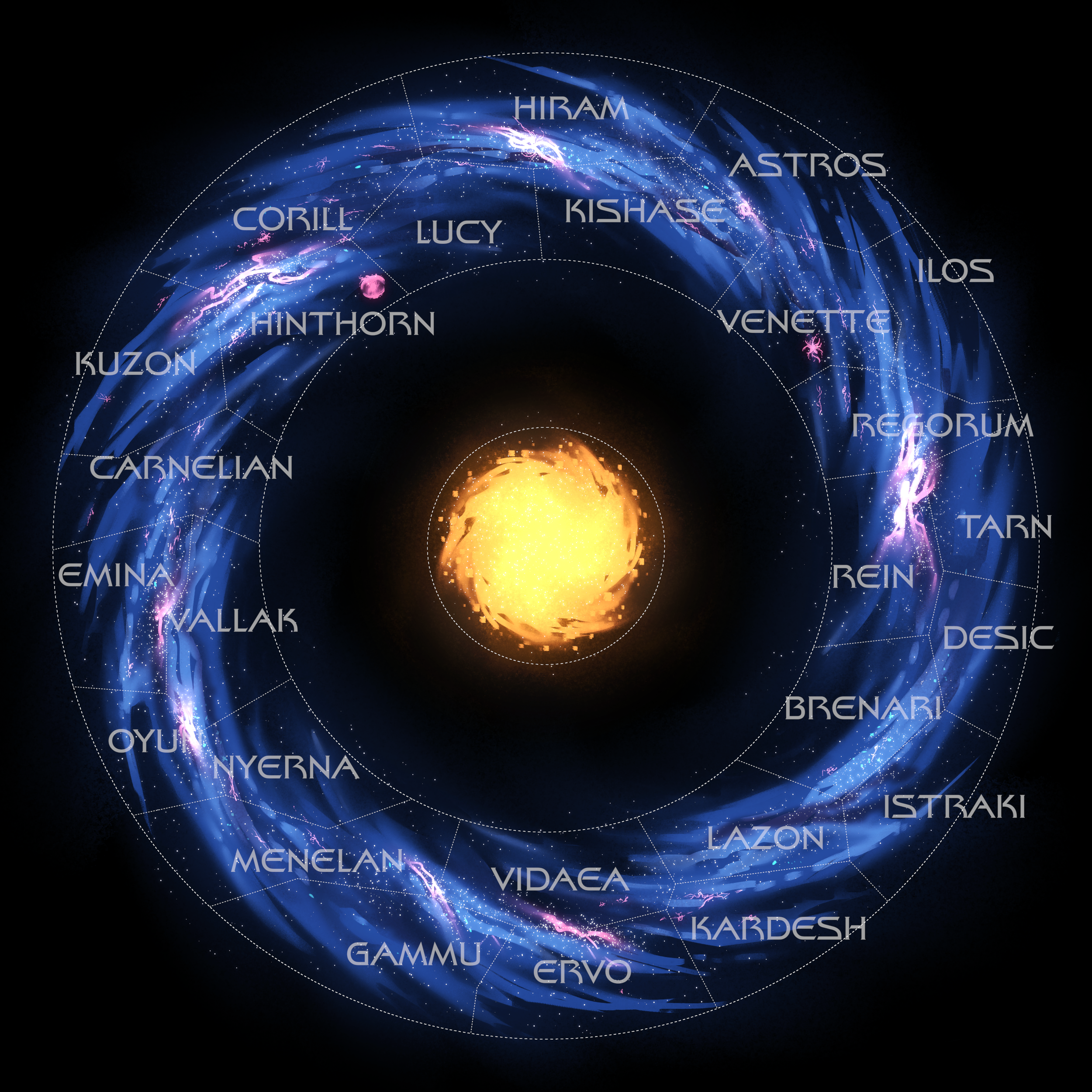 The galaxy's central hub of political activity is the nebulous ring that encircles the galactic core. The core itself is a region left as uninhabited as the void beyond the Silky Way, as the fall of the Qomarat Empire by civil wars and the later eruption of the supermassive black hole's accretion disk cleansed the region of any life. The core, regardless, is a fascinating region in scientific regard as it contains Demos, the central supermassive black hole of the galaxy, which binds it together as a star binds a planetary system. Between the two aforementioned regions is a vast cosmic gap as desolate as the emptiest voids, home to rogue states bickering for smidgens of resources in a state of perpetual turmoil unseen by the wider galaxy.