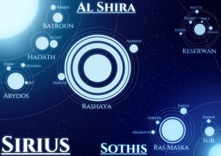Sothis (سوثس) is the calmer star, the white dwarf sometimes lovingly known as the Pup Star. Its light is dim even from its remaining planets, whose migration inward has given them positions near the stellar remnant's temperate zone. The planets around Sothis experience two daytimes, with Al Shira overpowering their own parent by a variable but notable amount, depending on Sothis' position in its own orbit. At its furthest, it has similar brightness to Al Shira from the perspective of its planets; at the closest approach, Al Shira outshines it by a factor of about seven for Sur and almost forty for Ras Maska. The worlds of Sothis experience extreme temperature variations throughout the star's orbit due to this eccentricity.