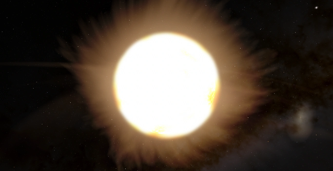 When the hydrogen fuel is just gone, the star expands into a hypergiant star, or an Ofpe/WN9 while also cooling in temperature. An example of a massive Ofpe/WN9 is the Peony Star. It is located in the galactic centre of Via Sagittaria and is very bright, with a luminosity of 3.2 million Stellar Luminosities. These stars will lose mass at furious rates, often losing entire Stellar Masses in tens of thousands of years, when they will lose their hydrogen and become conventional, hydrogen-free Wolf-Rayet stars, as Romano's star has become. At the time of its discovery from Humans, Romano's star was an Ofpe/WN9 star that was variating in brightness, while now it has lost much mass and is a WN star that is quickly losing mass. The now hydrogen-free WRs are some of the most massive and brightest WRs, easily getting above 30 Stellar Masses and surpassing a million Stellar Luminosities. WR 142, a WO star, started its life as a 70 Stellar Mass star, and at the time of its discovery, was by far the most massive WO star at 28.6 Stellar Masses.