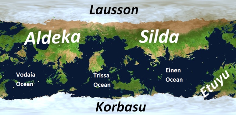 Telusia has two landmasses, and four continents: Silda, Aldeka, Korbasu, Lausson and Etuyu. There are also three oceans: Vodaia, Trissa and Einen.