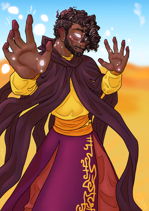 Aerashani have dark skin spotted with shifting points of light. Sensitive parts of their body also tend to glow slightly, including their blank eyes. Their builds are entirely identical to humans, but they are about 20% lighter. Aerashani fashion tends to be minimalist and practical, accounting for their desert home and keeping their thick locs of hair protected.