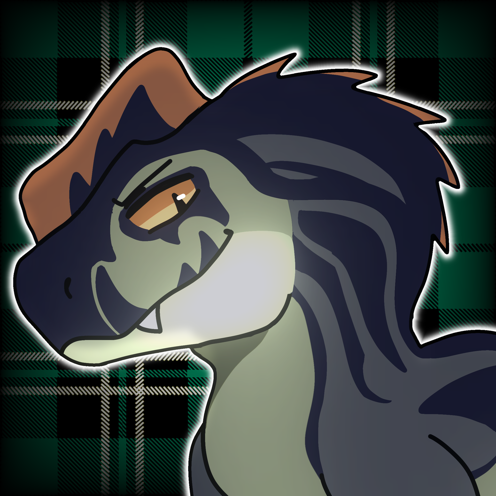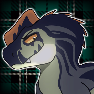Thane is a female Proceratosaurus standing 3'2" tall and stretching 9.8 feet in length. Her sharp amber eyes match the warm tones of her crest and feathers, while bold black stripes carve striking patterns across her soft gray body. Her face, underbelly, and lower limbs fade into a pale green hue, adding contrast to her markings. A few teeth jut from her maw, lending her a naturally devious expression. Her tail is rounded and cat-like, ending in a sleek black tip.