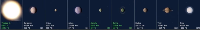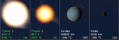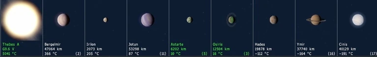 The Thebes A system has a total of 8 worlds, of which 3 are gas giants and 5 are rocky planets. These are in order: Bergelmir (Gas Giant), Irilon, Jotun (Gas Giant), Astarte, Osiris, Hades, Ymir (Gas Giant) and Cinis.