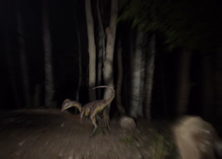 Civilian Keryth Olarie was returning home from a walk around 13 minutes before the 11th hour of the day. The man had noticed a rather strange rustling noise towards his left. The man was a nature photographer so he always carried a camera around with him just so, if he could, he could take photos of nature. He walked steadily towards the rustling and heard rather strange snarling sounds. The man paused and pulled out his flashlight just in case. Flashlights tend to scare off wild animals as they fear the sudden brightness in the night. The man peered over some rocks and saw a silhouette of some sort. He could make out a tail and the bright eyes but not much else so he shone his light and was horrified. Before him, stood a giant reptile with twin crests over its head. It stood bipedal and snapped its head back at him. In its jaws were what he assumed was a giant rat of some sort (authorities are still attempting to identified the hunted species). The animal let out a slight hoot and hiss. The man snapped the photo. Just after the image was taken, the bipedal crested animal swallowed its meal whole and continued to stare back at him. The man stared back at the animal as it cocked its head in curiosity. For a period of 2 seconds the two stared at each other until the nearby trees shook, a flock of birds flew away, and the animal ran back into the woods never to be seen again.