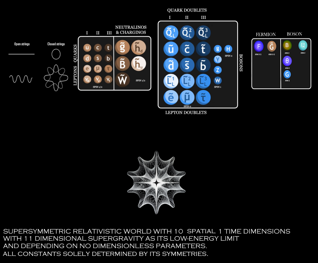 В Стандартной модели частицы часто рассматриваются как безразмерные точки. Однако революционная модель, известная как теория струн, предположила, что эти точечные частицы являются всего лишь приближениями. На более фундаментальном уровне частицы состоят из вибрирующих нитей энергии, называемых струнами. Поскольку эта модель включает в себя суперсимметрию, ее называют теорией суперструн. Когда струны встречаются, они могут взаимодействовать, сливаться или разделяться. Их различные режимы вибрации проявляются как различные частицы в наблюдаемых масштабах. Интересно, что один режим вибрации ведет себя точно так же, как гравитон, гипотетическая квантовая частица гравитации.