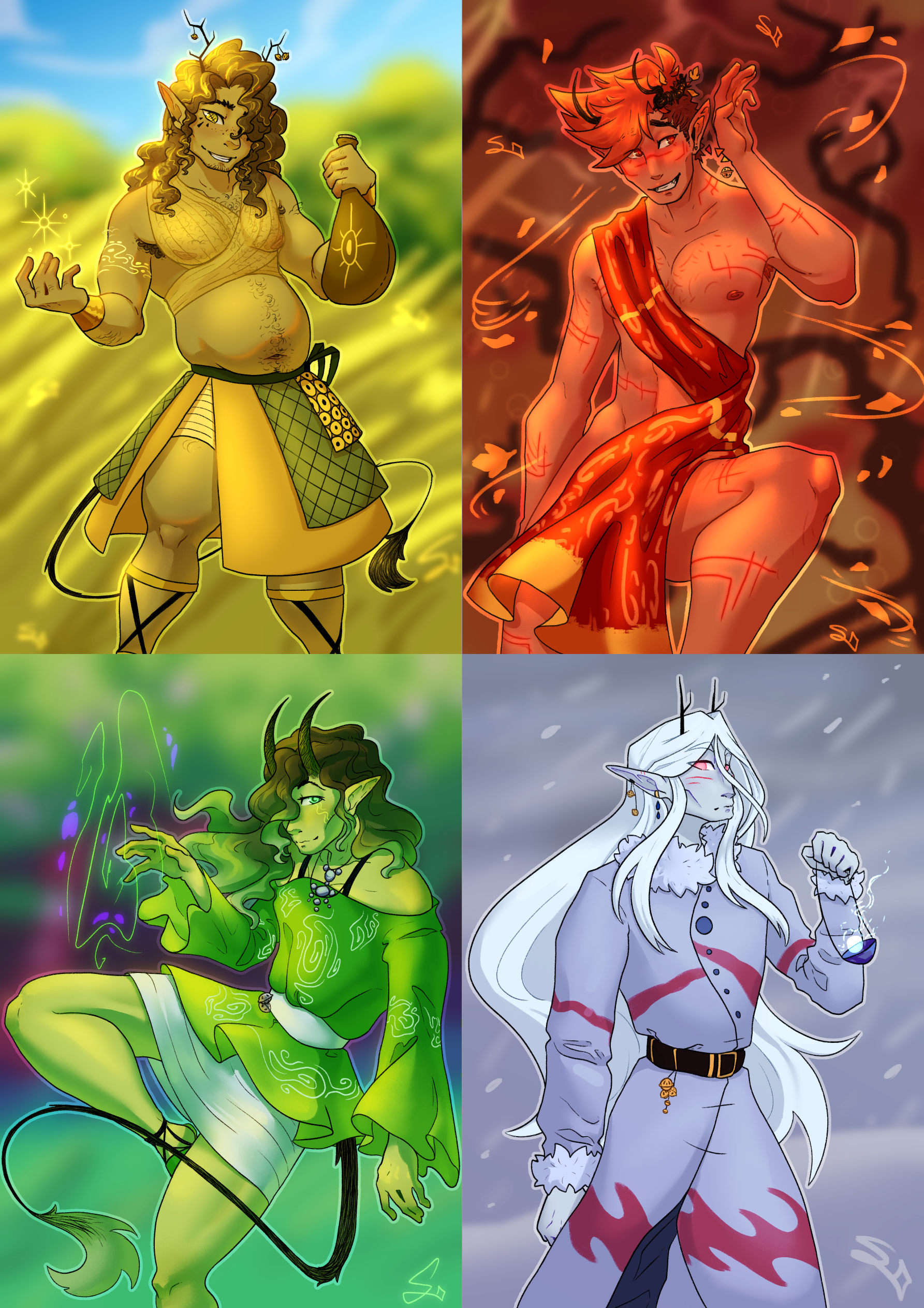 The Bofhianni are the Annhi Dhriaf of the summer, representing its constant strong heat and its relatively peaceful weather. From the same glades as the Fhriarhianni, they emerge in the summer to wander the wilderness and drink in the scenery. Their silken clothes are a recognizable combination of gold and green, made to vent away heat and keep them mobile.