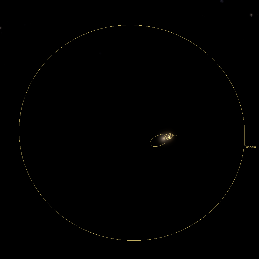 Before the system would reach its present state however, a third object approached the binary from interstellar space. Taozora, a much older object with its own small collection of planets, became captured in orbit around the binary at a very long distance, completely emptying the inner Limit Cloud and bringing the configuration of Verda System to its modern form.