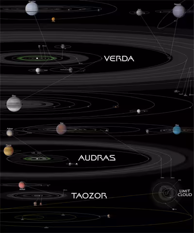 Surrounding Verda and Audras is the planet Altos, an exceedingly distant and cold planet which is not particularly well-populated. Even further out, beyond Taozora, is the planet Terminus, which might as well not exist for its extreme remoteness from the stars. Surrounding the three stellar bodies, there is a large cloud of comets unimaginatively known as the Comet Cloud, extending roughly 1.5 light-years out from the system.