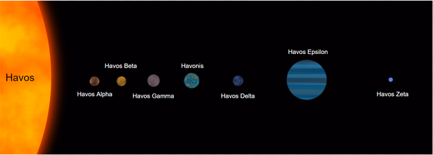 Havonis is a quite large world, being over 15,980 Kilometers. The Planet is known for its grasslands, its warm climates and beautiful oceans. A standard day is 22 hours, while a year is 324 days. It is the 4th planet in the System.