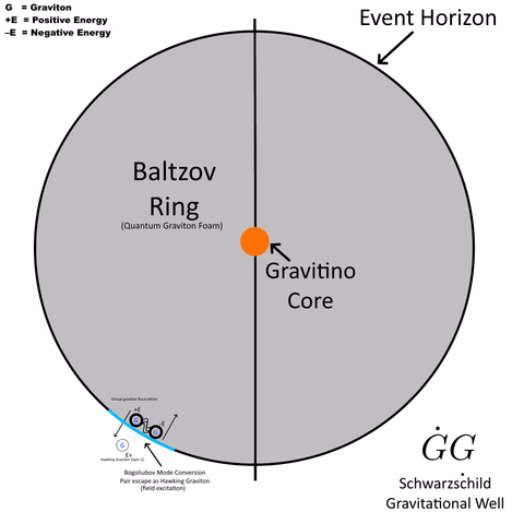 As mentioned previously, The interior of a Gravitational Well is dominated by a probabilistic cloud of graviton quanta—an energetic, turbulent zone extending from the Gravitino core to the Event Horizon (in the idealized non-rotating case). Rather than being governed by a smooth classical metric, this region is shaped by an intensely excited and fluctuating quantum field, hμν, representing perturbations in the very geometry of spacetime.