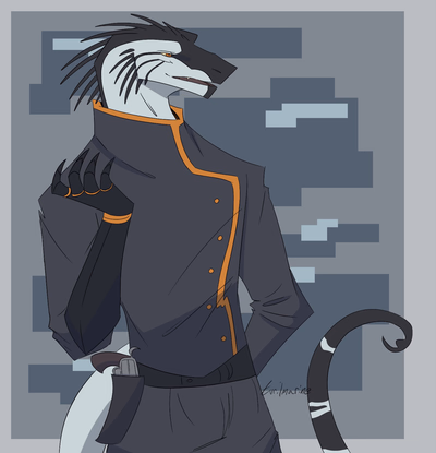 Zoro’s mother, Beatrice, a drepanosaur Saurian naturalist came to Frioskea to study the region’s flora. There she met Valentín, a Dragonborne privateer, after helping him out when he fell in the harbor. There, they met again often and eventually married. Since dragonborne and saurians are not normally able to conceive offspring, it was a welcome surprise to have had Zoro. He did well in school, and graduated early. After doing so he moved to Veneria, where he met Mudskipper, the former boss of the Venerian Outfit. The Outfit admired Zoro for his social abilities, and was soon sworn in. The boss also enjoyed Zoro as an oddity. He befriended Ezra Von Kreuger, a crimson dragonborne immigrant, who also was in the gang. A couple years later, they met a young Regulus Edgeworth, Lucian and Luciana Anastasia. Zoroko took the three under his wing, and they were sworn in once they were well-trained and old enough. Except Lucian, who was sworn in at 17. To make room for Regulus to become boss and for Zoro to become underboss, he organized for Lucian to assassinate Mudskipper. This didn’t last too long however, when Regulus’ surrogate son Cobalt Edgeworth became 16, he replaced Zoroko in his position of power. The hybrid had resented Cobalt since, causing him to form his own group of disgruntled members of the Outfit who aimed to either chase away or kill Cobalt.