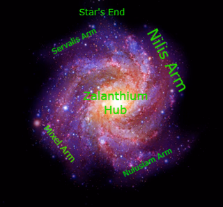 The Zalanthium Galaxy has 4 spiral arms, named the Servalis, Nilis, Nulusiam and Mixel arms respectively, and a semi-spiral arm named Star's End. The centre of the Galaxy is called the Zalanthium Hub. |